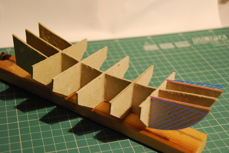 Widać już charakterystyczne dżonkowe "ości". I jak zaznaczyłem na zdjęciu już pierwszy, na szczęście niewielki błąd. Przykleiłem prostopadle wzmocnienia kadłuba podtrzymujące dziób , zamiast skierować je lekko ukośnie w bok. Utrudniło mi to później przyklejanie burt i spodu kadłuba - musiałem wkleić w te miejsca kawałki grubej tektury, żeby mieć powierzchnię do której mógłbym się "dokleić". Tak to jest, jak się człowiek śpieszy żeby ujrzeć wreszcie bryłę kadłuba. :roll: Nauczka? Czytać plany i relacje dokładnie, czytać :!: I nie spieszyć się...