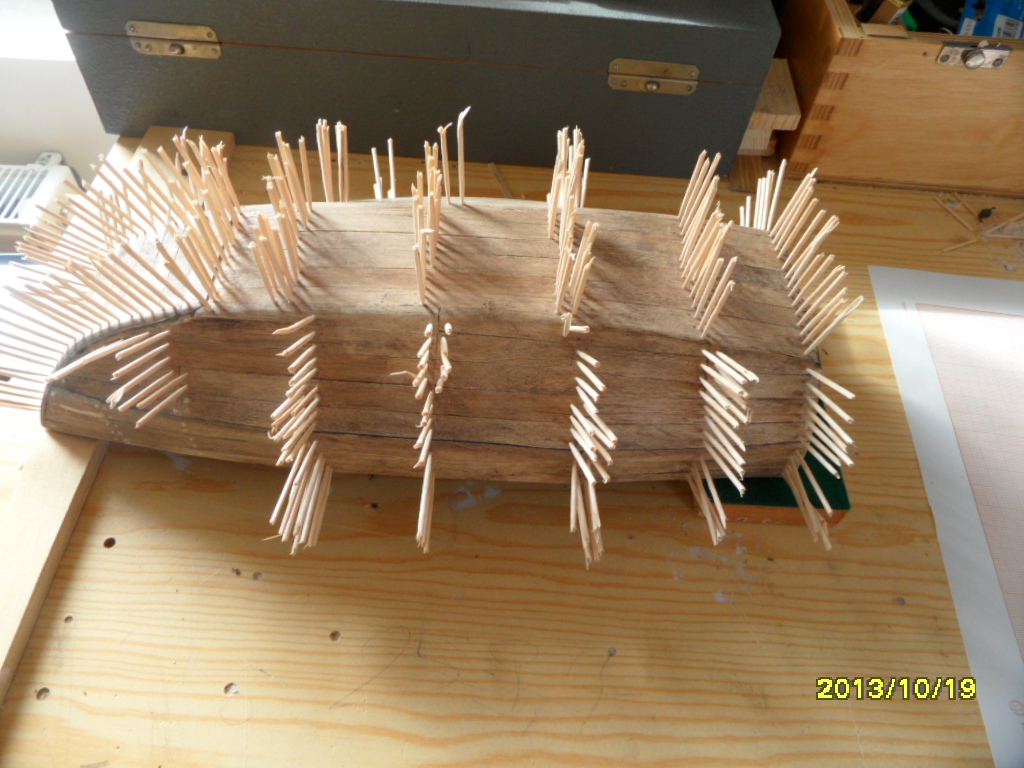 Widoczne otwory w kadłubie to przygotowanie pod kołkowanie. Otwory ф1mm. Wierciłem po dwa otwory na końcu każdej deseczki i po jednym w jej środku. Wszystkiego ok 350 szt. Trochę pracy, ale było warto. Kołkowanie przy wykorzystaniu wykałaczek. A oto efekt: