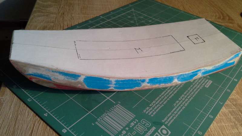 1. Zdecydowałem się na eksperyment "sztukowania" (nie wiem w zasadzie jak to inaczej nazwać) elementów poszycia za pomocą taśmy malarskiej tj. oklejałem elementy szkieletu taśmą, odrysowywałem element poszycia, naklejałem na tekturę i wycinałem. Technikę tą podpatrzyłem, o ile dobrze pamiętam, w relacji RomkaS z budowy Santa Marii. Tam była stosowana do robienia planek z forniru.