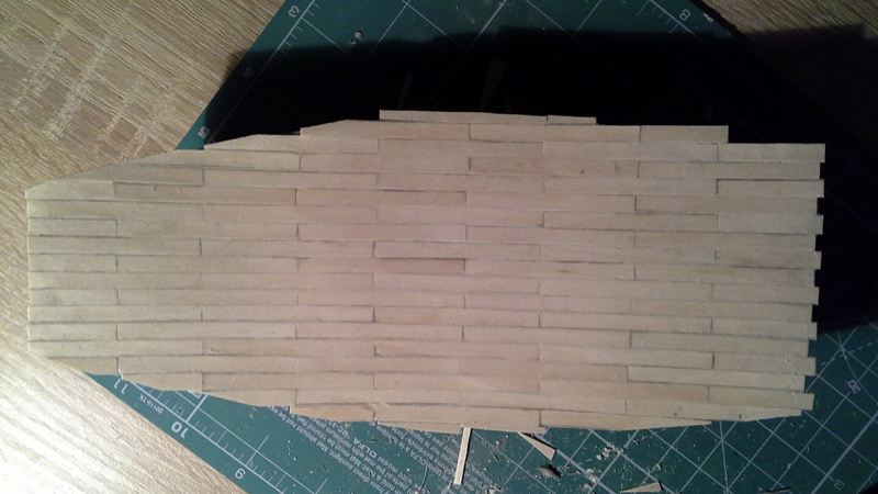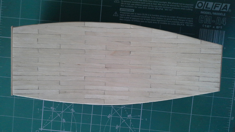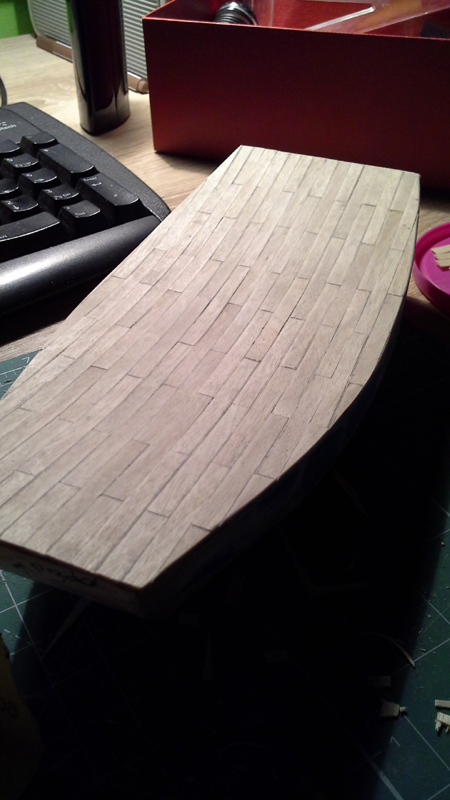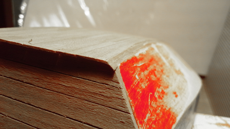 Część dna kadłuba zacząłem oklejać w podobny sposób (w sensie cienkimi paskami forniru). Użyłem forniru z czereśni lub gruszy, niestety nie potrafię ich rozróżnić.