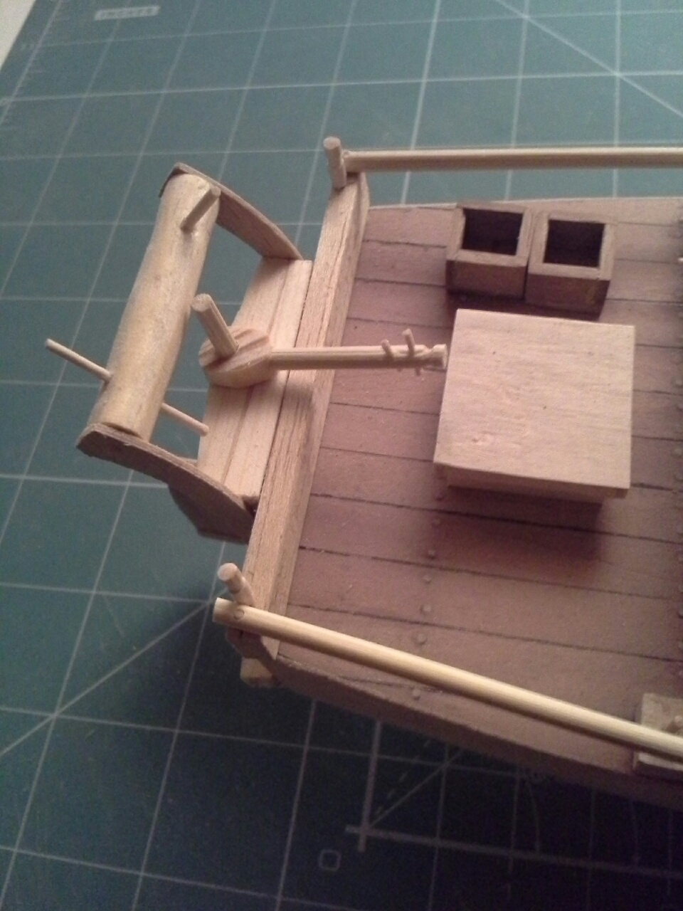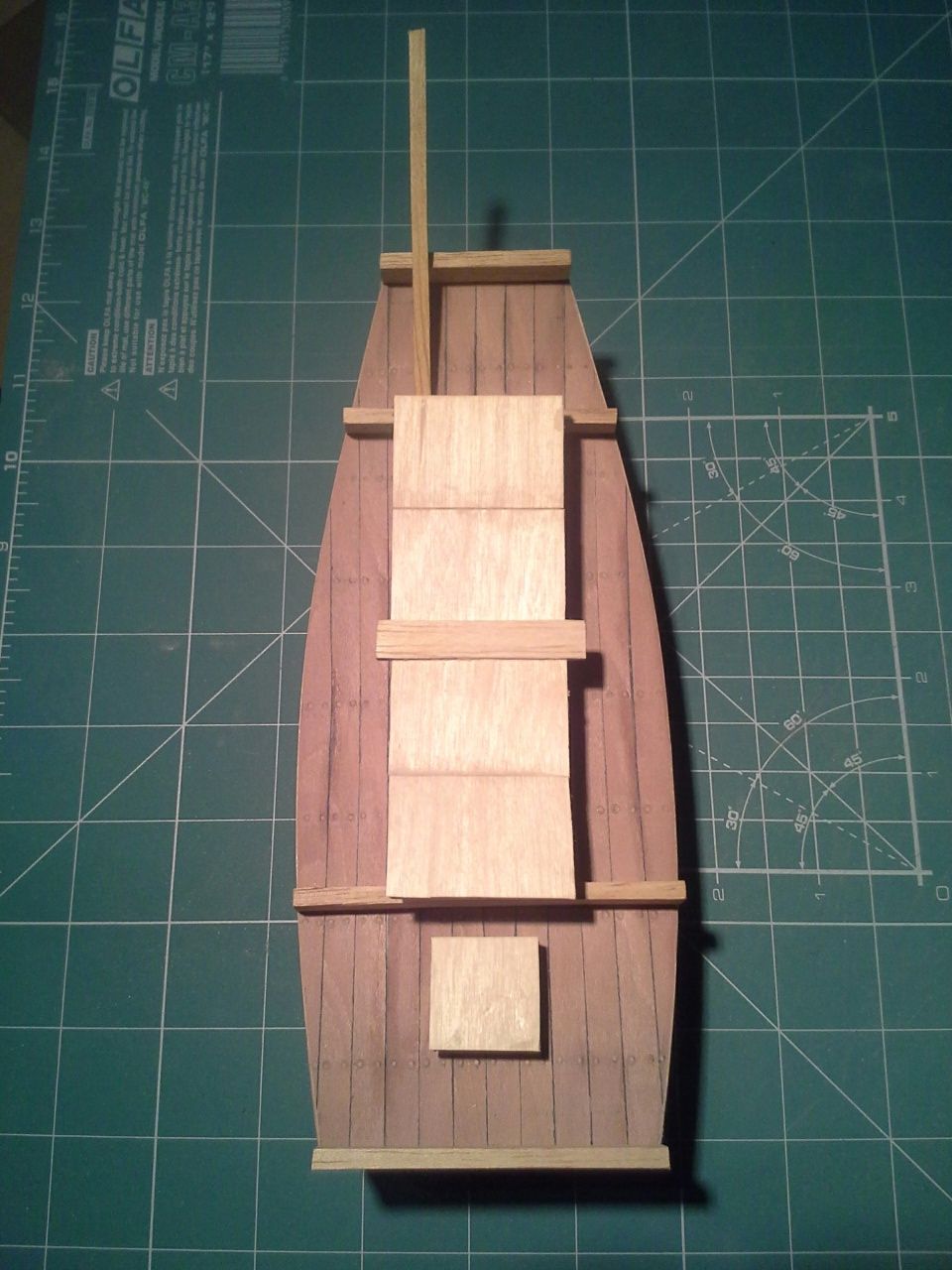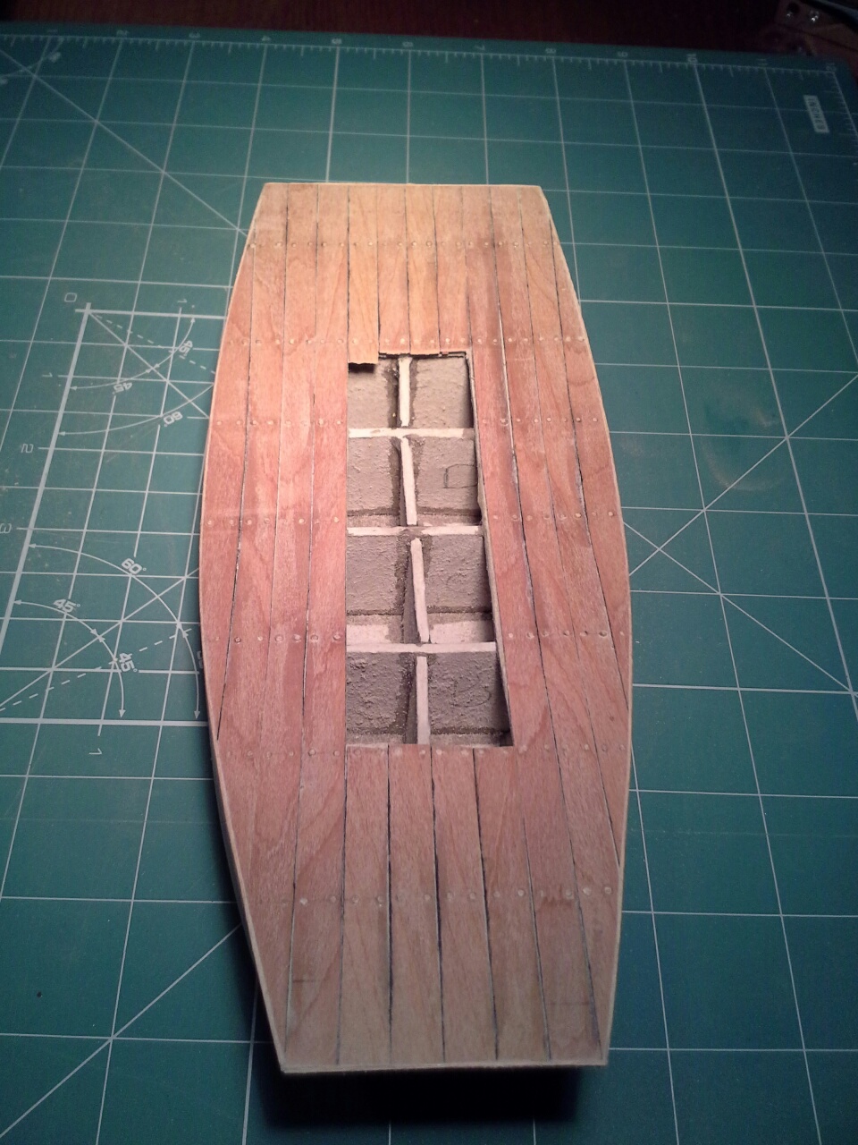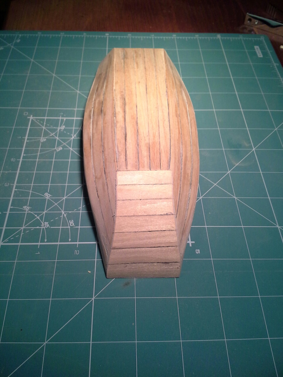 Witajcie, Powstała, podstawka. Jak wyschnie trzeba ją wyszlifować i pomalować. Model powstaje z trzech rodzajów forniru i drewna. Myślę, że na sam koniec pomaluję go rozcieńczonym kaponem. Zrezygnuje z bejcowania. Na razie spasowałem, elementy rufy i dodałem kołki na dziobie.