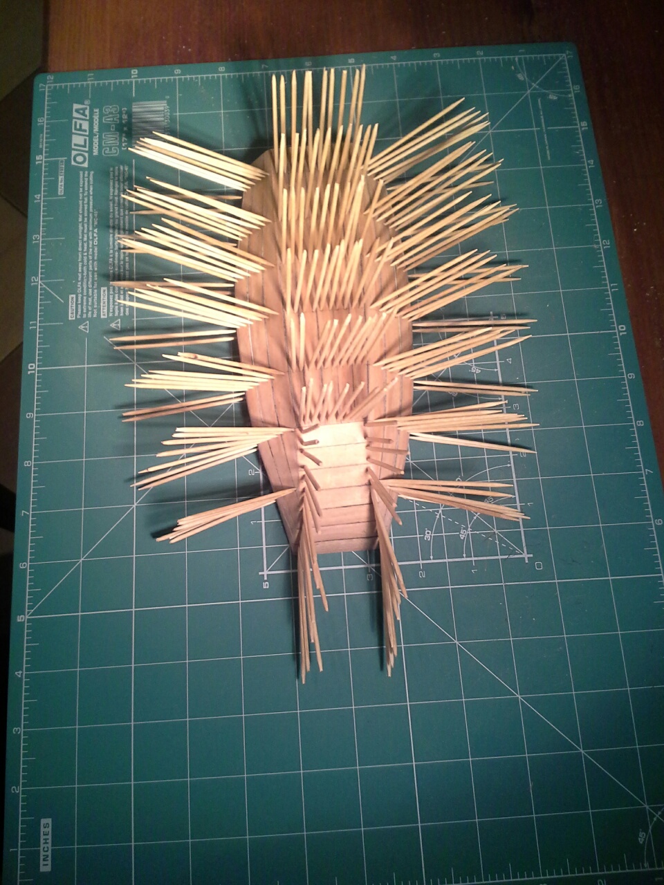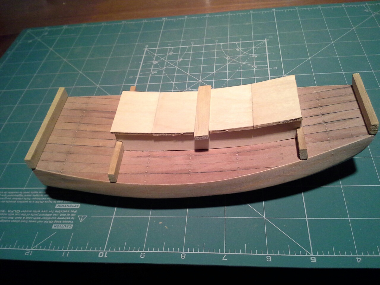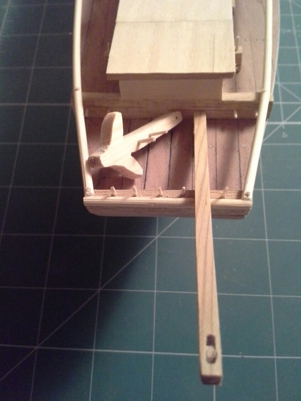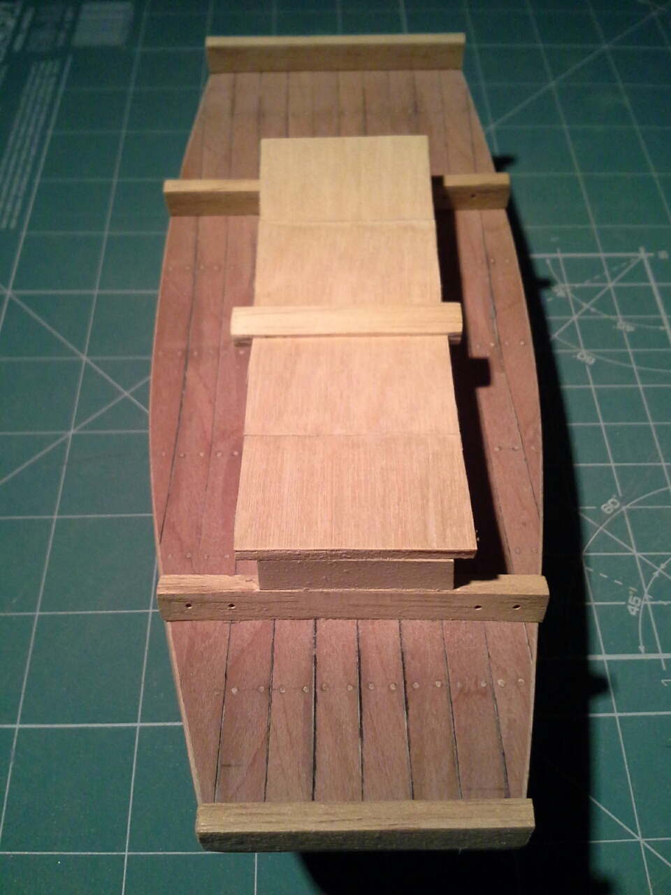 Witajcie, Powstała, podstawka. Jak wyschnie trzeba ją wyszlifować i pomalować. Model powstaje z trzech rodzajów forniru i drewna. Myślę, że na sam koniec pomaluję go rozcieńczonym kaponem. Zrezygnuje z bejcowania. Na razie spasowałem, elementy rufy i dodałem kołki na dziobie.
