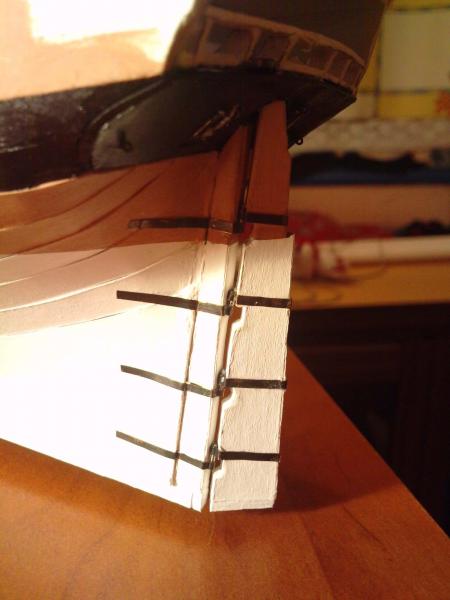 Poszycie wykonałem tak jak Shipyard kazał, a więc normalnie wyciąłem paski z tektury i skleiłem obok siebie, a wrażenie poszycia zakładkowego wynikają z powstałych nierówności. Nie wiem jak to zrobić żeby nie było tych nierówności? Czy kanty pasków zeszlifować pod kątem tak aby jakoś dopasować elementy czy jak? no i tutaj problem bo jak jeden już się przyklei to później nie można go przerabiać. Zastanawiam się nad zeszlifowaniem tych nierówności papierem ściernym, ale nie wiem czy efekt końcowy nie będzie gorszy od aktualnego. bo jak zeszlifuje to czy nie będzie papier chropowaty w tych miejscach? Niestety papier to nie drewno :/