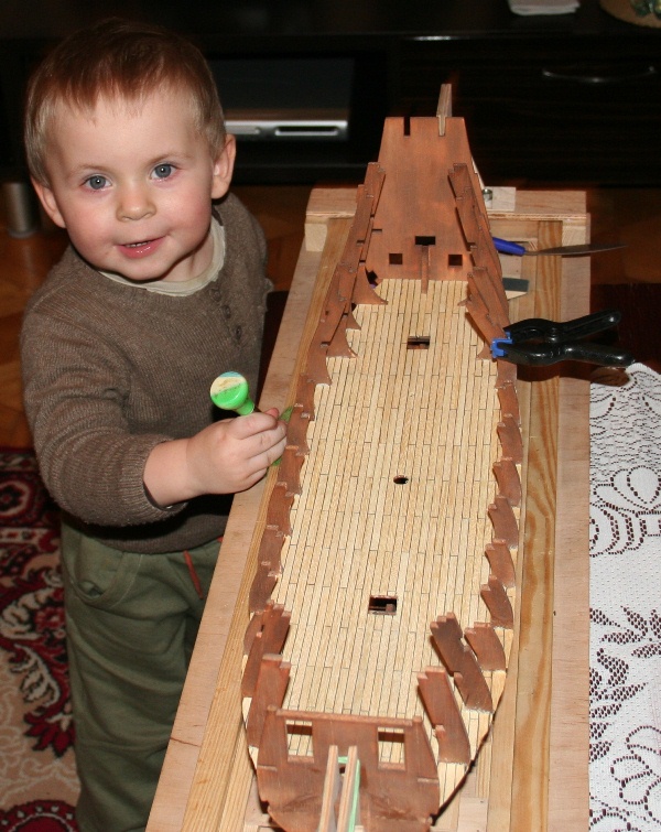 jedno zdjęcie planów, jedno zdjęcie drewnianej zawartości zestawy, jedno drobnicy, jedno stoczni itd, a reszta ewentualnie w galerię. Te zdjęcia nic nie wnoszą do tematu, pokazują też niewiele (ot przyklejona wręga z każdej możliwej strony). Apeluję do prowadzącego relację o zdroworozsądkową wstrzemięźliwość, gratulując pięknej i porządnej, jak do tej pory, pracy.