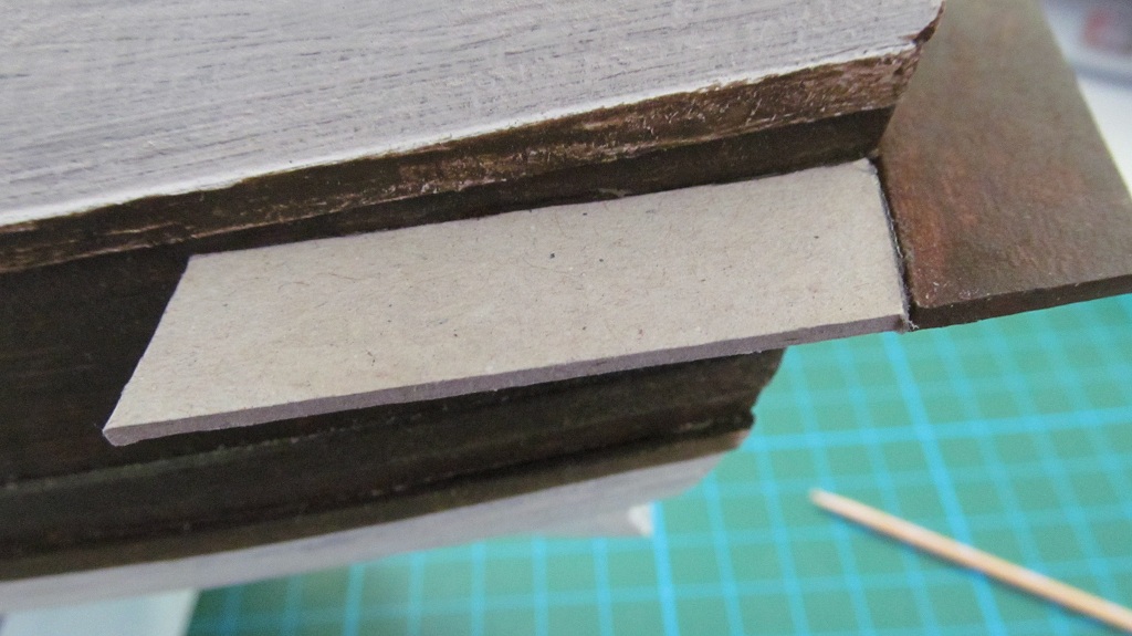 Z tektury grubości 1,2 mm wykonałem większość kołkownic. Wg planów wszystkie mocowane do wewnętrznych części burt. Z zaimpregnowanej tektury, po przeliczeniu i narysowaniu kształtów wyciąłem wszystkie niezbędne elementy. Krawędzie i niedokładności zeszlifowałem papierem ściernym (120 grad). Przed przyklejeniem pomalowałem elementy farbami akrylowymi. Nagielbanki jeszcze nie mają otworów na kołki.