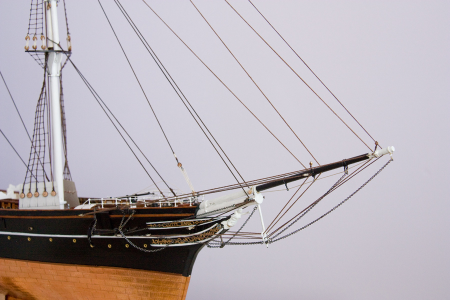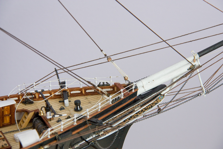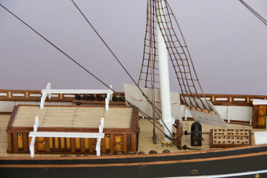 Ponoć pośpiech jest wskazany, ale zupełnie przy czymś innym, to przy tym modelu spieszyłem się abym był w stanie go skończyć. Z tego powodu zrobiłem trochę uproszczeń w olinowaniu ruchomym. Do całkowitego skończenia modelu zostało mi wyregulowanie linek i uformowanie żagli oraz zrobienie pokrowców na szalupy.