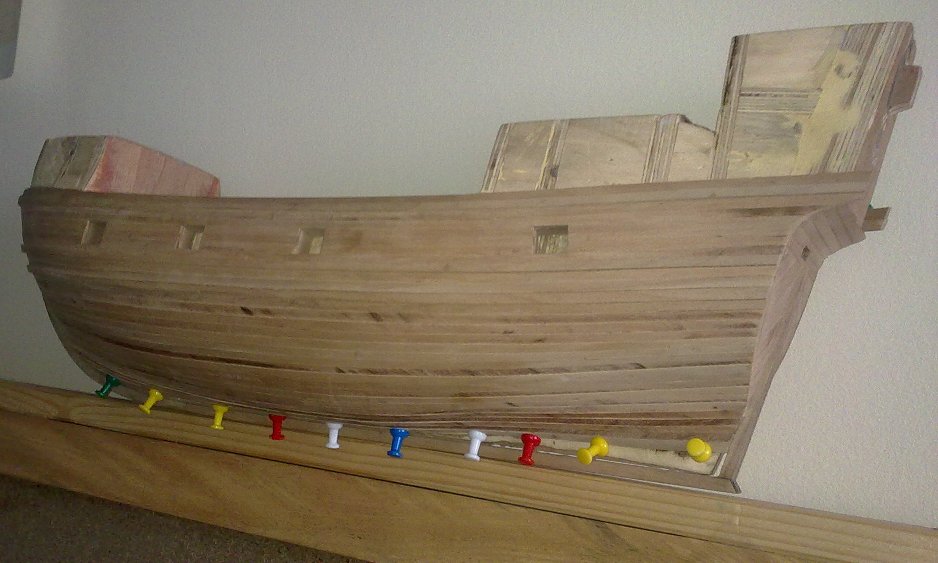 Witam,listewki ,planki powinno się kłaść na przemian burtami od dołu do góry, po dwie trzy listwy,zapobiega się w ten sposób zwichrowaniu modelu ,przy tak przygotowanym "kopycie" ma to mniejsze znaczenie ,ale powinno się to wykonywać na przemian,pozdrawiam marek