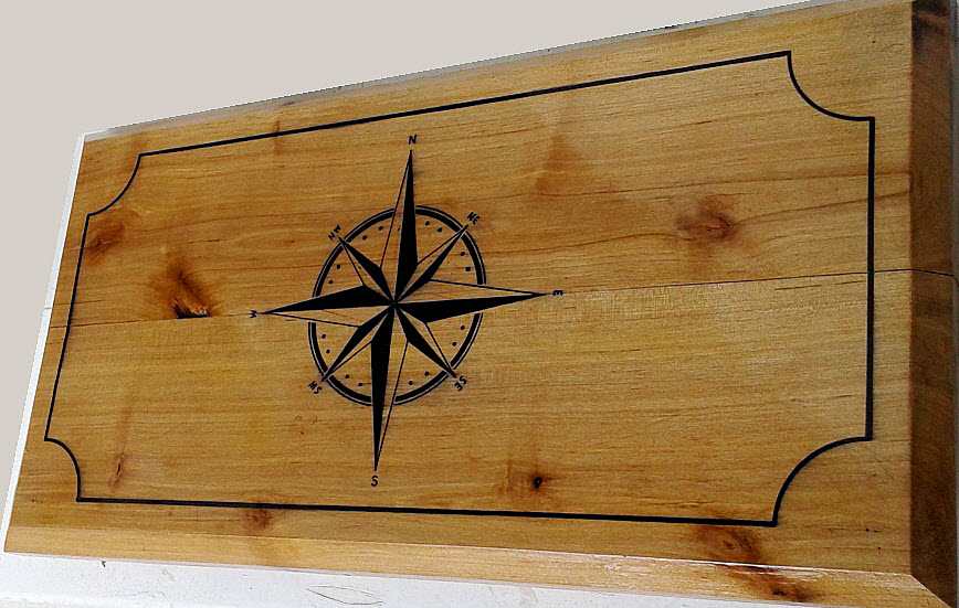 Podstawka zrobiona jest z dwóch kawałków olchy, które po połączeniu i oszlifowaniu zostały "za-caponowane" , następnie róża wiatrów namalowana markerem - po czym na wierzch warstwa lakieru - na razie pierwsza a będzie prawdopodobnie kilka.