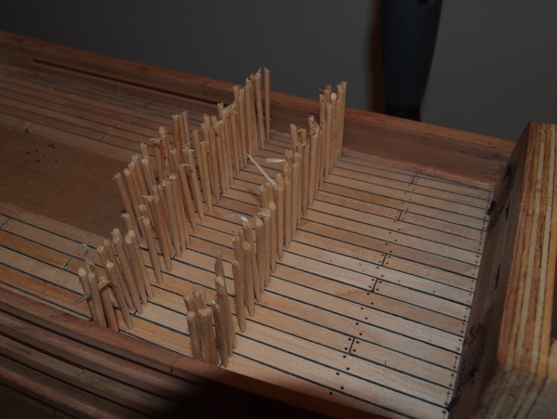 Idąc za ciosem -> kołkowanie pokładu - otworki wiercone wałkiem giętym dremela po uprzednim wyznaczeniu ich miejsc i napunktowaniu "szpikulcem", następnie wklejone wykałaczki rozcieńczonym z wodą pattexem i na końcu szlif - kołkowanie wyszło praktycznie niewidoczne. Tutaj również trzeba się przyznać do błędu: jak można robić burty przed kołkowaniem...!!! potem nijak się dostać do przycinania i szlifowania - na szczęście tym razem się jakoś udało