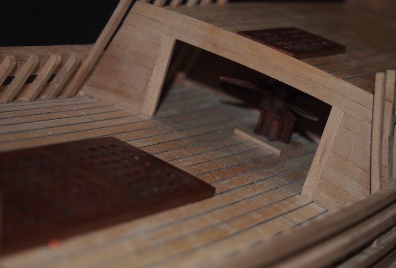 Kolejny etap to posadowienie górnego pokładu, ale przed przyklejeniem trzeba było posadowić na swoim miejscu kabestan. Przy tej okazji postanowiłem, że ten element otrzyma... "życie" - został osadzony na drucie - więc ma możliwość obracania ;)