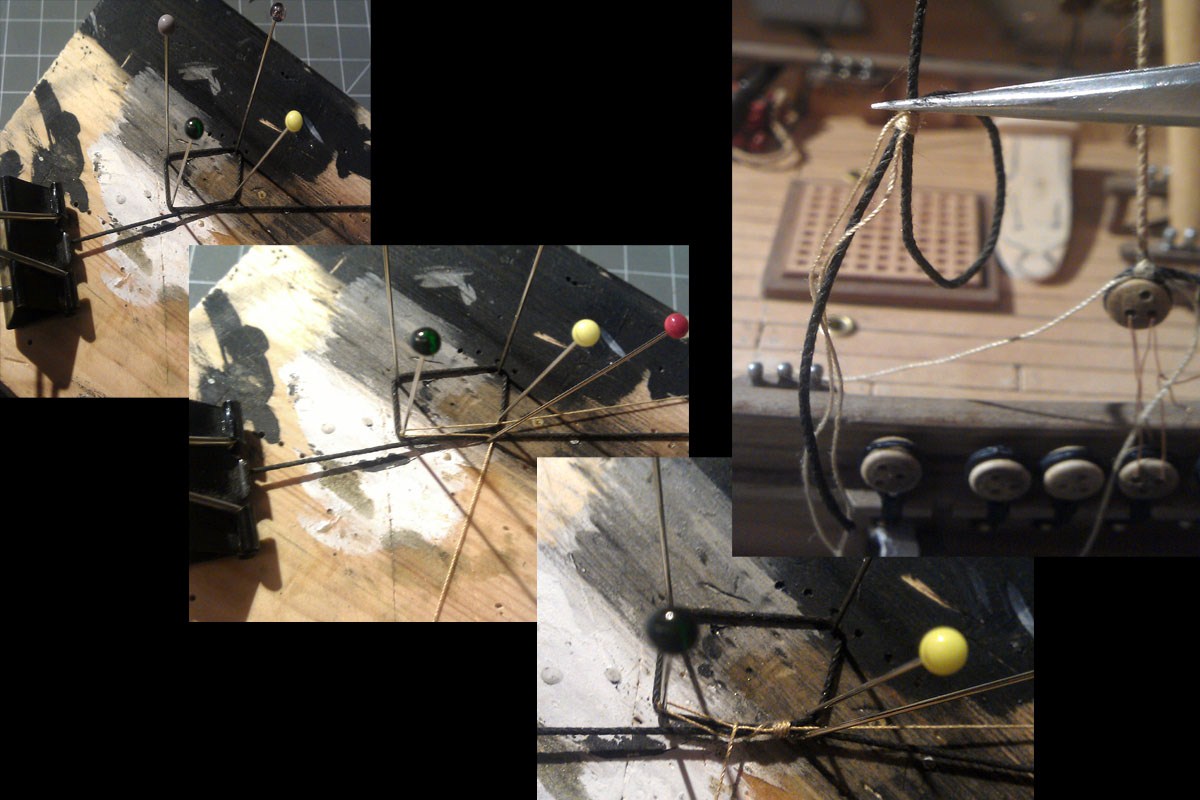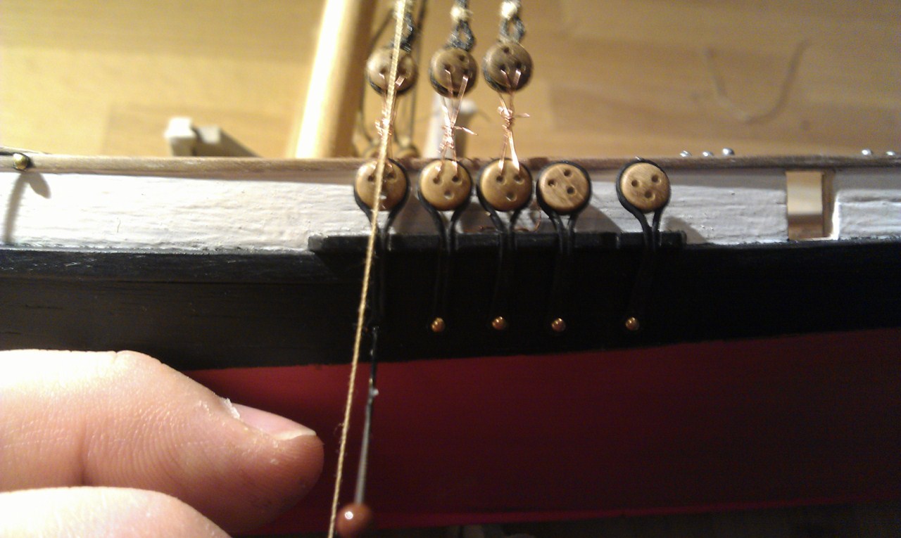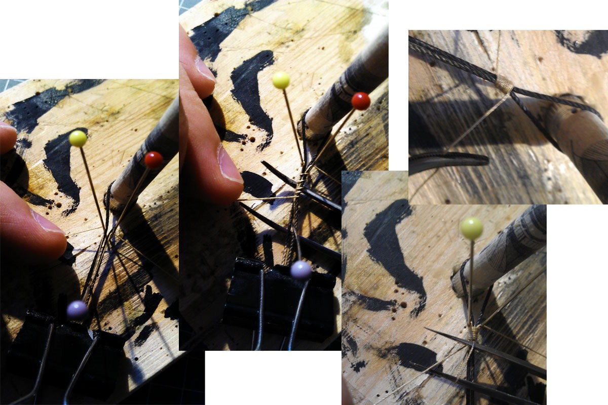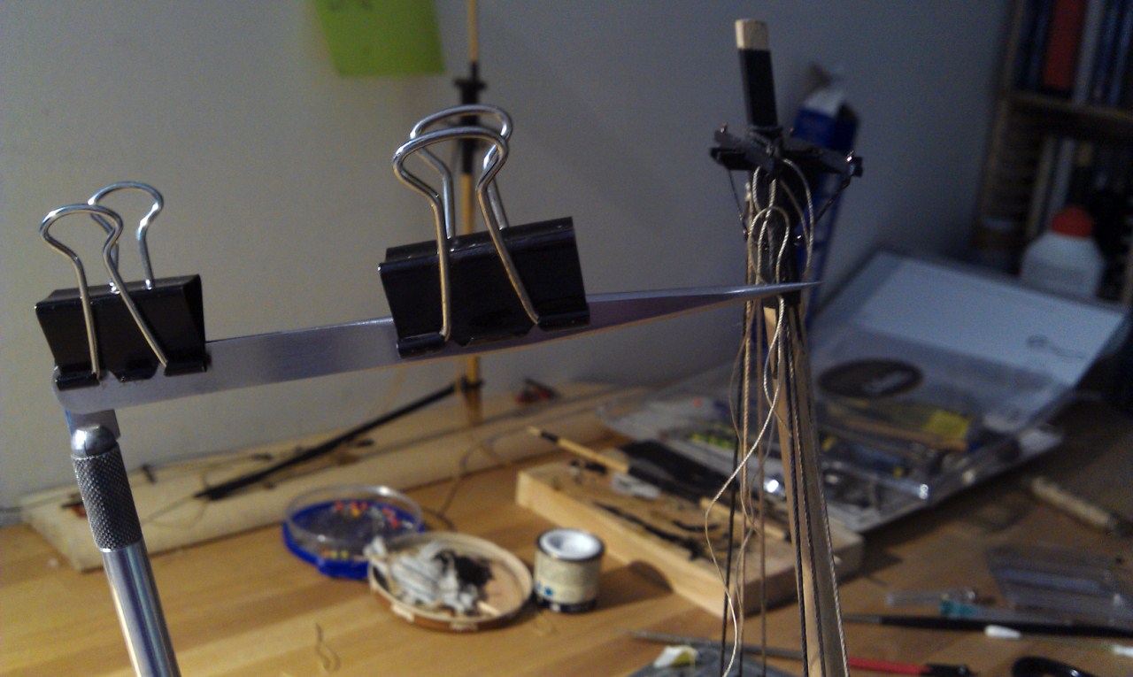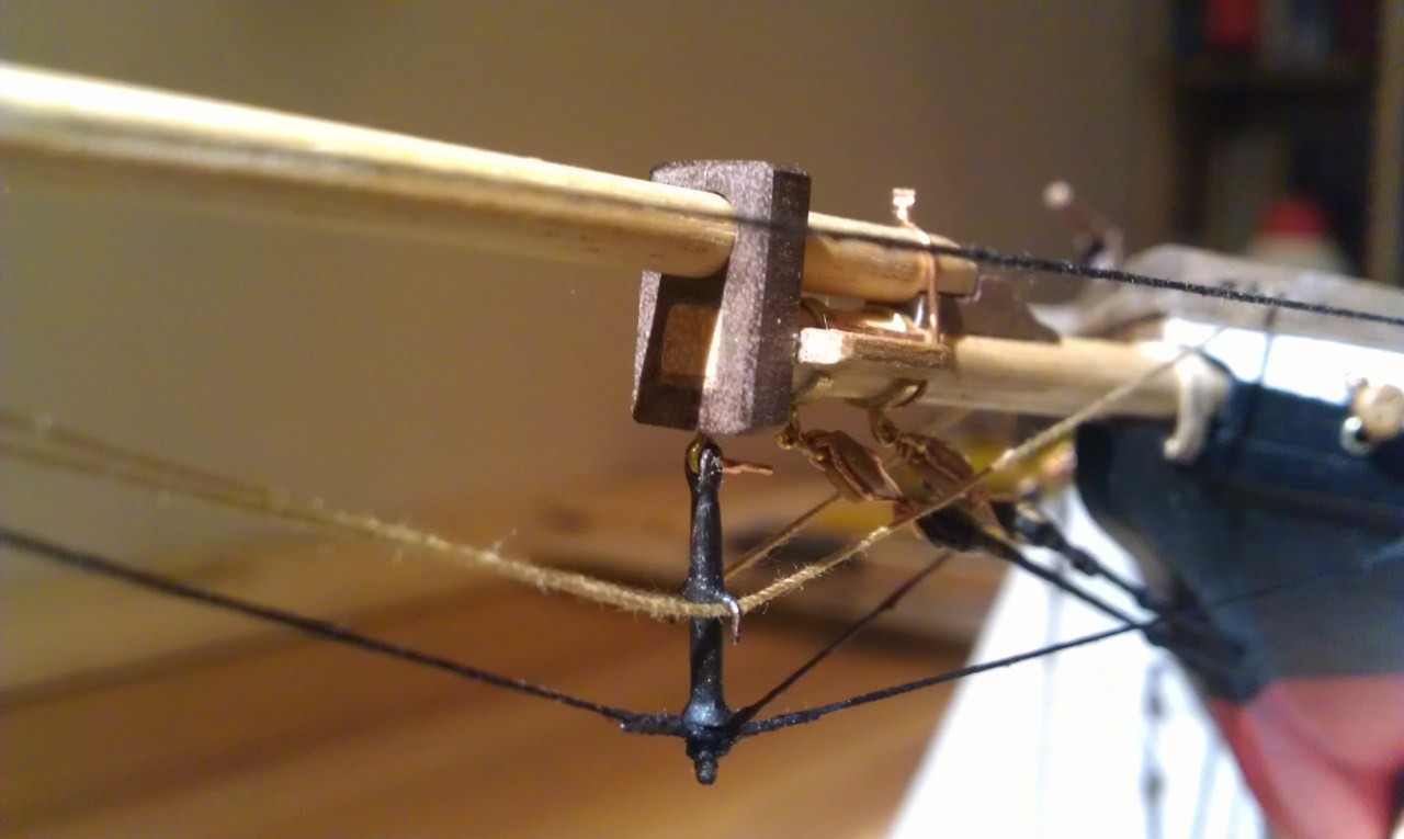 W ostatnim tygodniu pracowałem nad olinowaniem stałym. Przykleiłem kolumnę fokmasztu. Zawiązałem wanty kolumny fokmasztu i foksztag. Bukszpryt otrzymał już prawie całe stałe olinowanie, pozostał mi jedynie stensztag.