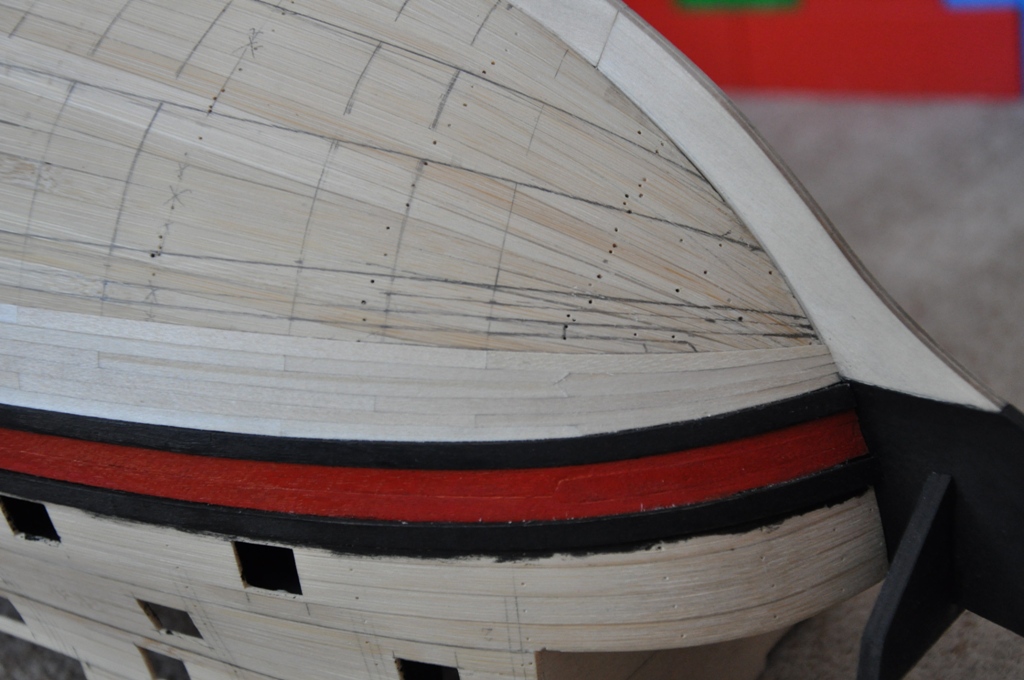 teraz na kadłubie zaznaczyłem miejsca przebiegu potencjalnych wręg aby łączenia planek wypadały w jednej linii (długości planek teraz odmierzam z kadłuba), bo na poprzedniej burcie gdy brałem stałą 9cm długość linie te w wyniku obłości kadłuba trochę się rozjeżdżały, wyłapałem to już w trakcie klejenia kolejnych planek i potem starałem się już na bieżąco korygować,