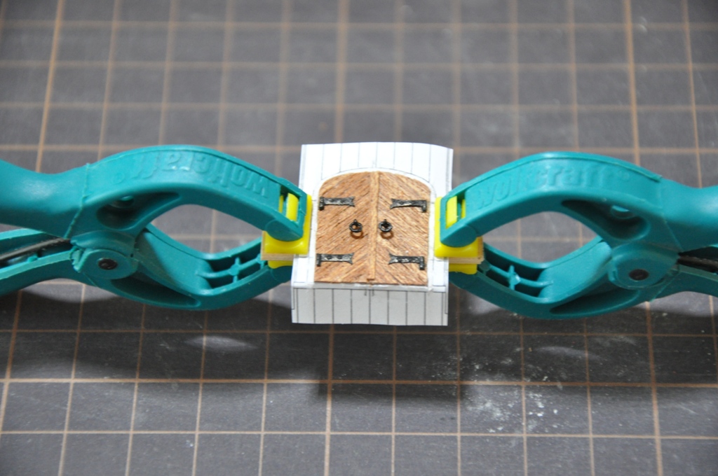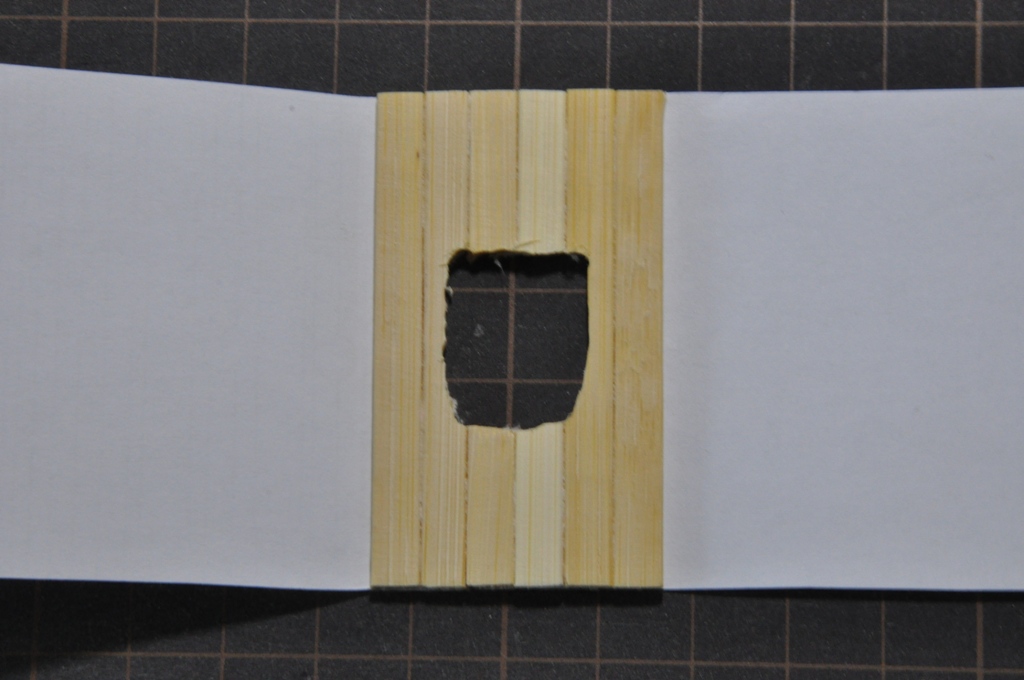 teraz pora na zawiasy (wykonane z papieru, z jednej strony papier zamalowany tuszem, z drugiej wzmocniony klejem CA, tuleje zawiasów wykonane z kropli kleju)