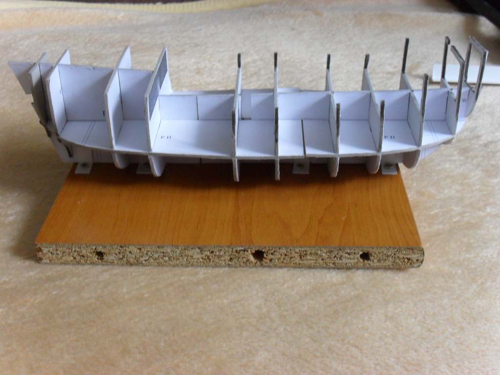 , zabrałem się za budowę szalupy na razie jestem na etapie kopyta (chyba tak to się nazywa). Kopyto ma szkielet kartonowy o grubości 1 mm. Owe kopyto zostało zapiankowane pianką montażową oraz po wyschnięciu zaszpachlowane szpachlą samochodową. Efekt poniżej: