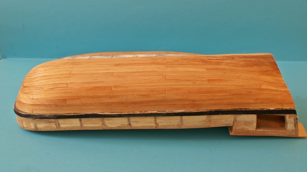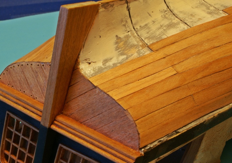 W modelu mała demolka, usunąłem parapety na rufie, (były nieprawidłowo przyklejone do pawęży) i stewę, która wraz z parapetami, przeszkadzała by mi w przeszlifowaniu gwoździowania.