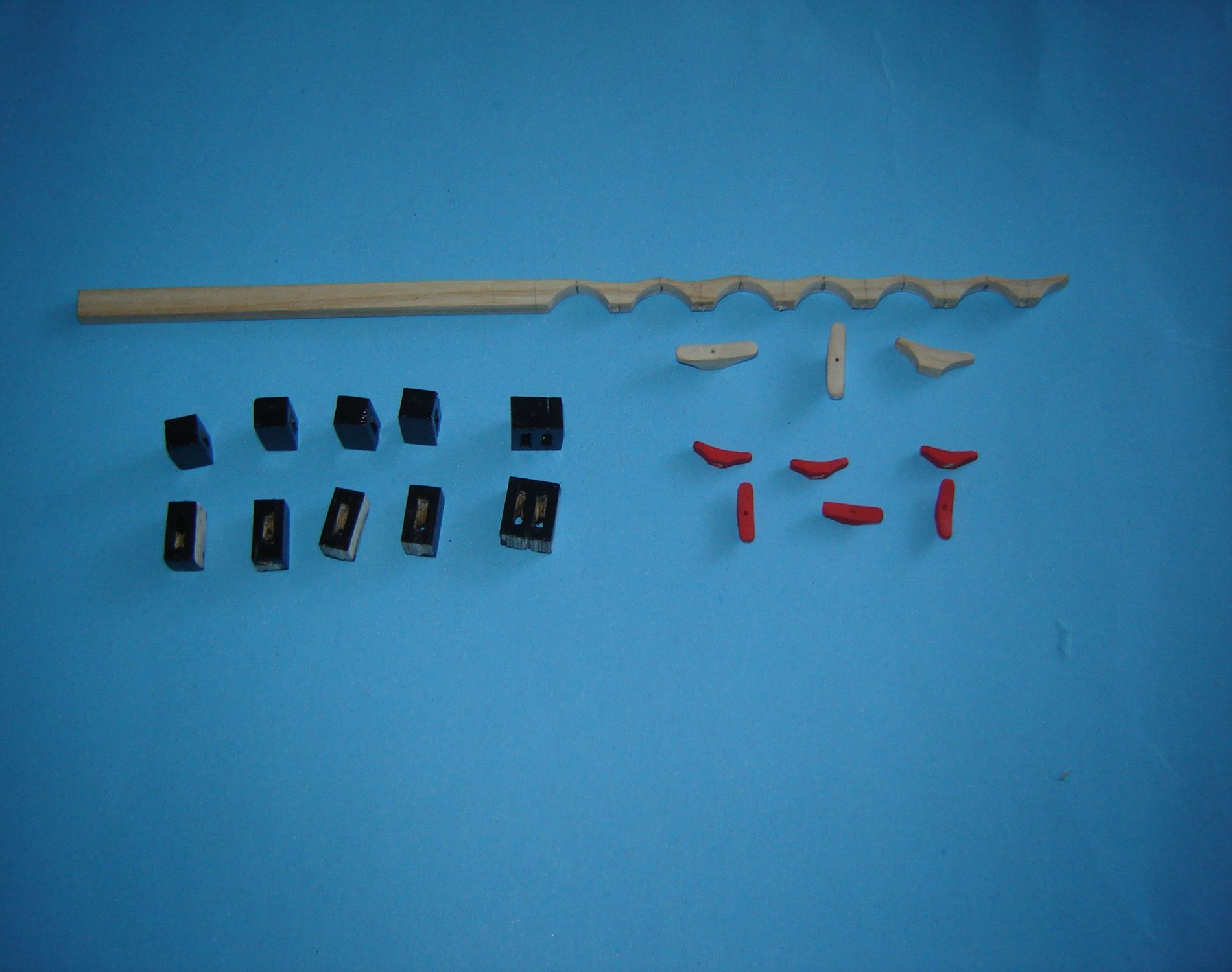Przeglądnąłem jeszcze raz plany otrzymane od Pitera i wiem ponad wszelką wątpliwość, że to czarne co ostatnio wystrugałem to na pewno jest komin od pieca okrętowego, natomiast o fiszbelce w planach nie ma nic więcej ponadto co już wiem. Szkoda tylko,że nikt z kogi nie chciał mi podać więcej informacji na temat fiszbelki. Poczekam aż kolega Sławek wróci z wczasów to na pewno podeśle mi jakieś materiały na ten temat. Ostatnio przez kilkanaście godzin sklejałem słupki z rolkami do których będą mocowane linki od żagli które po przejściu przez rolki odkładane są następnie na pachołkach lub knagach zamontowanych na burtach. Zamontowałem dziesięć takich słupków oraz 14 knag. 4 słupki zamontowane zostały na burtach na dziobie oraz 6 słupków i 14 knag na burtach rufy. Tyle na dzisiaj.