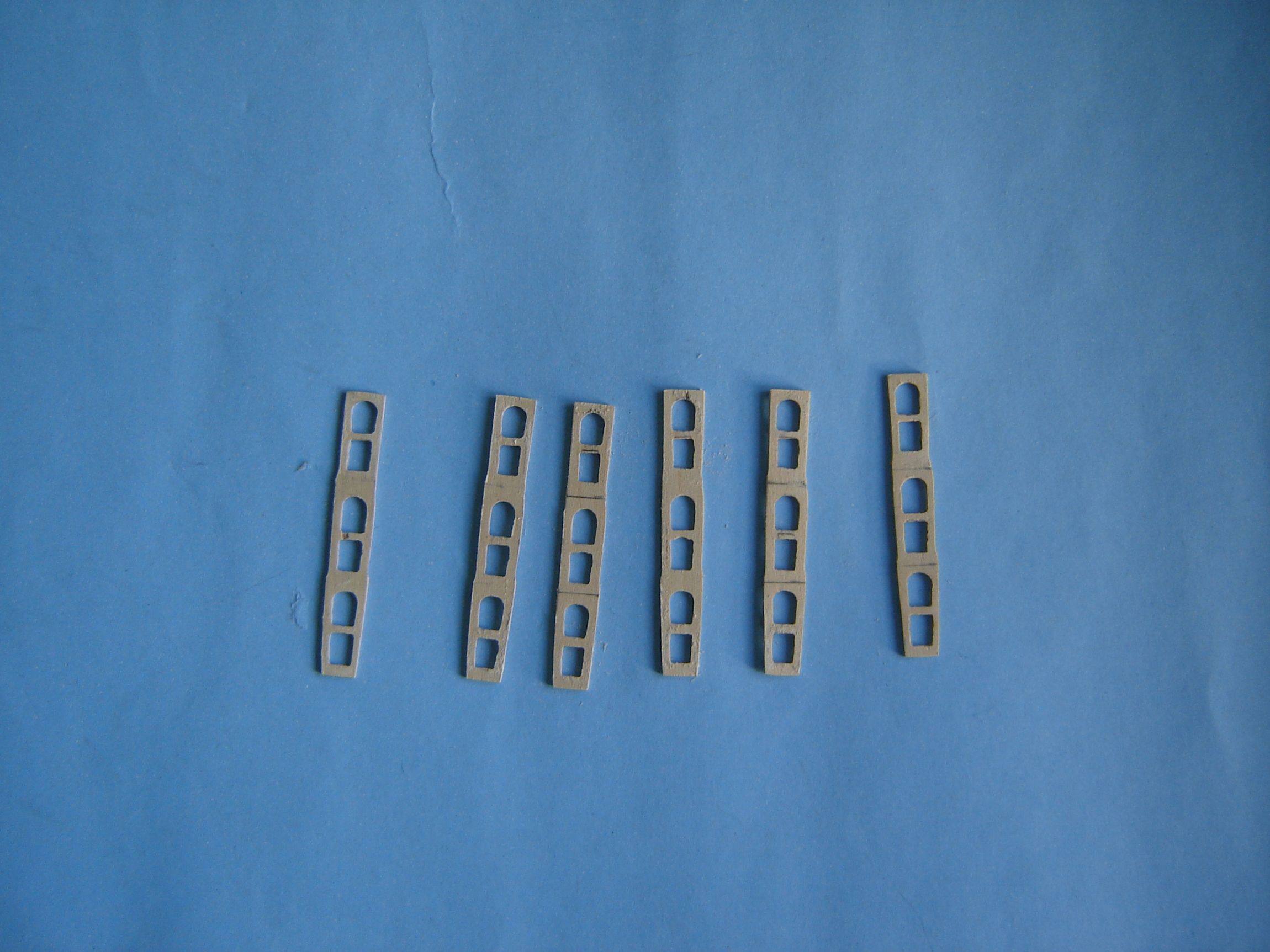 Dzisiaj chcę pokazać, że w czasie prac przy modelu nie zawsze wszystko wychodzi tak jak by się chciało i nie zawsze wszystko się udaje. Postanowiłem, że zrobię lampy oświetleniowe. Poszperałem trochę w necie i na kodze ale nic prawie nie znalazłem na temat lamp do mojego Enterpriza. Na każdym okręcie lampy są nieco inne. Postanowiłem więc, że lampy do mojego modelu wykonam na podstawie wycinanki. Wyciąłem z lotniczej sklejki brzozowej sześć listewek na których narysowałem kształt ścianek bocznych lamp. Złożyłem je razem i w miejscach gdzie są nazwijmy to otwory okienne wywierciłem otworki. Następnie iglakami w narysowanych miejscach wypiłowałem odpowiednie kształty otworów.