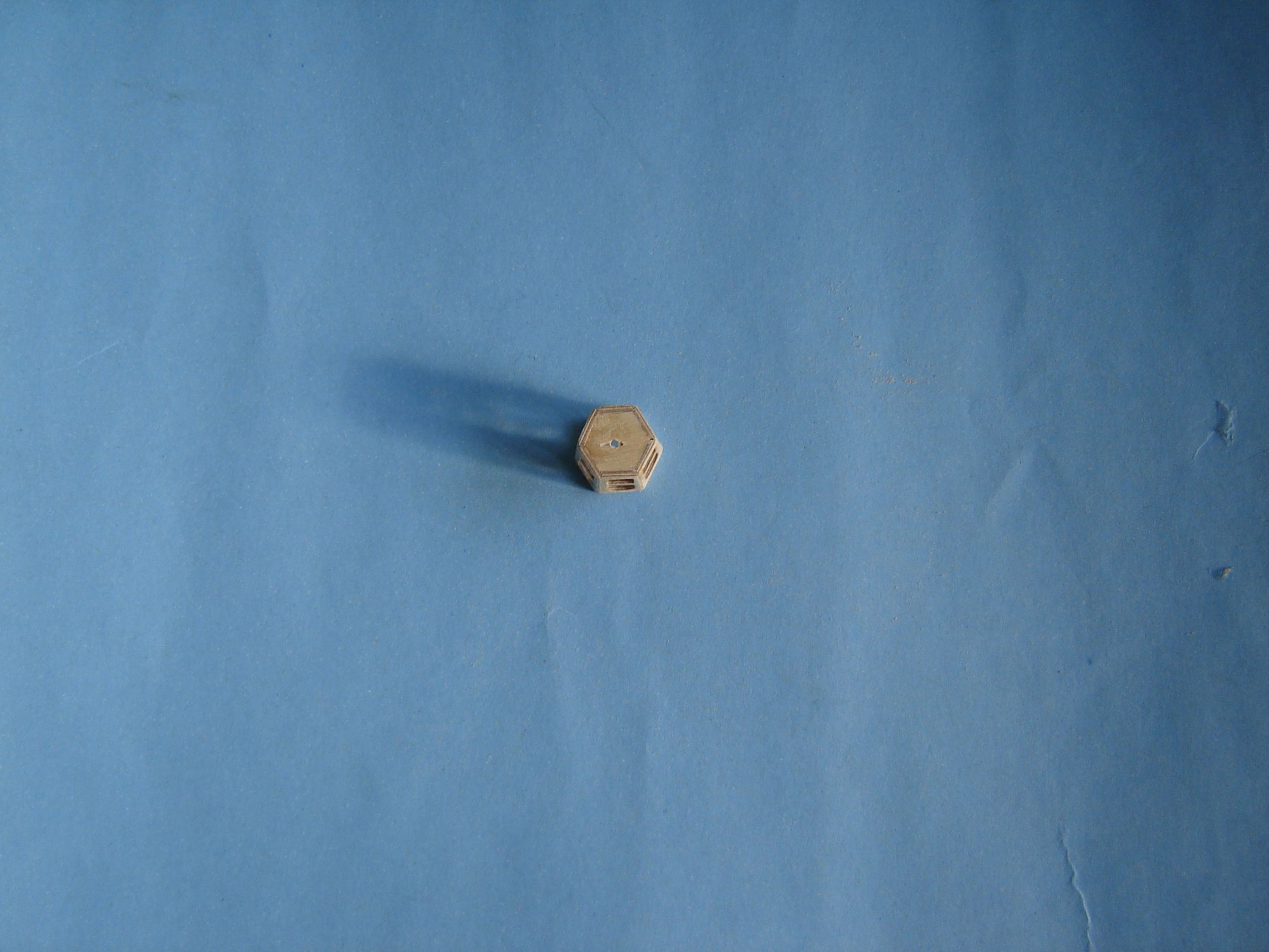 Podstawę lampy wypiłowałem w sześciokąt. Tym razem sześciokąt wypiłowałem iglakiem do środka. Na końcu wypiłowałem taką niby kulkę. Sześciokąty na czapę zaokrągliłem, skleiłem razem i wszystko nakleiłem na korpus lampy.