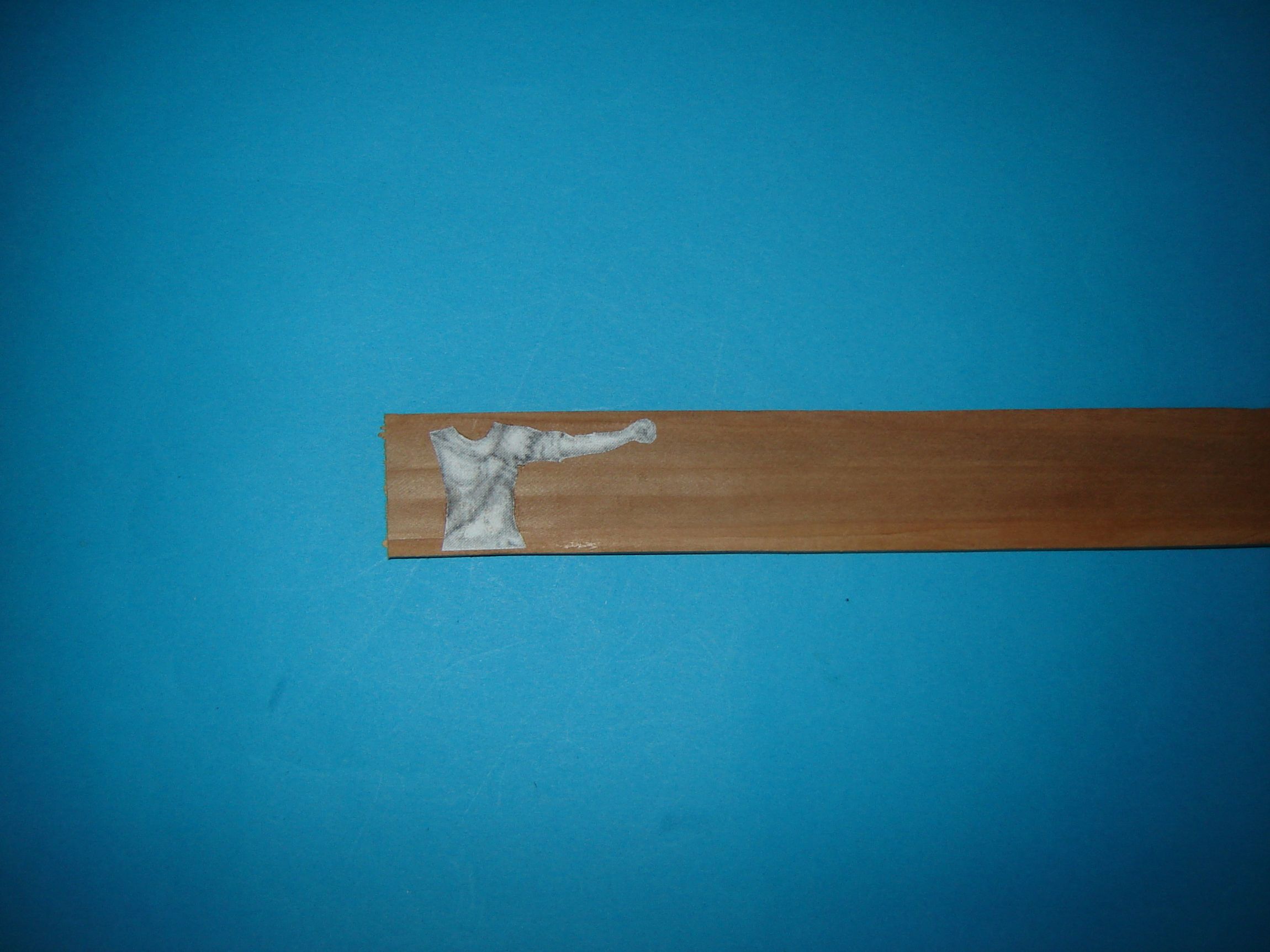 Ja zacząłem od tułowia a właściwie zbroi i lewej ręki. Wyciąłem ten element i nakleiłem na deseczkę z gruszy o grubości 4 mm. Głowa z wycinanki mi się nie podobała więc ją na razie odciąłem.