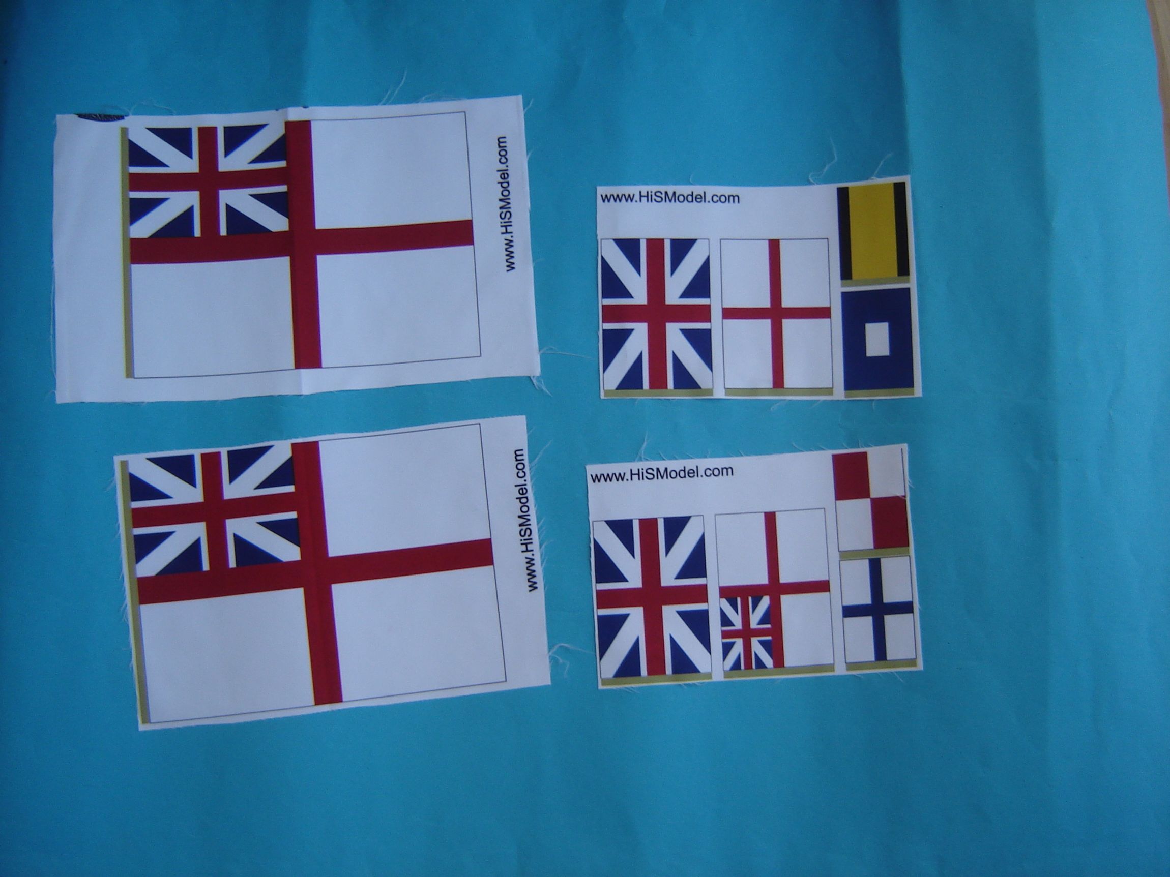 Czas zabrać się za prace wykończeniowe przy moim Enterprizie. Otrzymałem zamówione u Radka Basedy flagi. Pięknie wydrukowane obustronnie na cieniutkim jedwabiu. Żadnych zacieków czy plam. 2 największe mają wymiary 22cm x 16 cm, 4 średnie o wymiarach 10 cm x 7 cm oraz 4 sygnałówki o wymiarach 7 cm x 4,3 cm.Teraz muszę je tylko odpowiednio obrobić, uformować i zamontować na modelu.