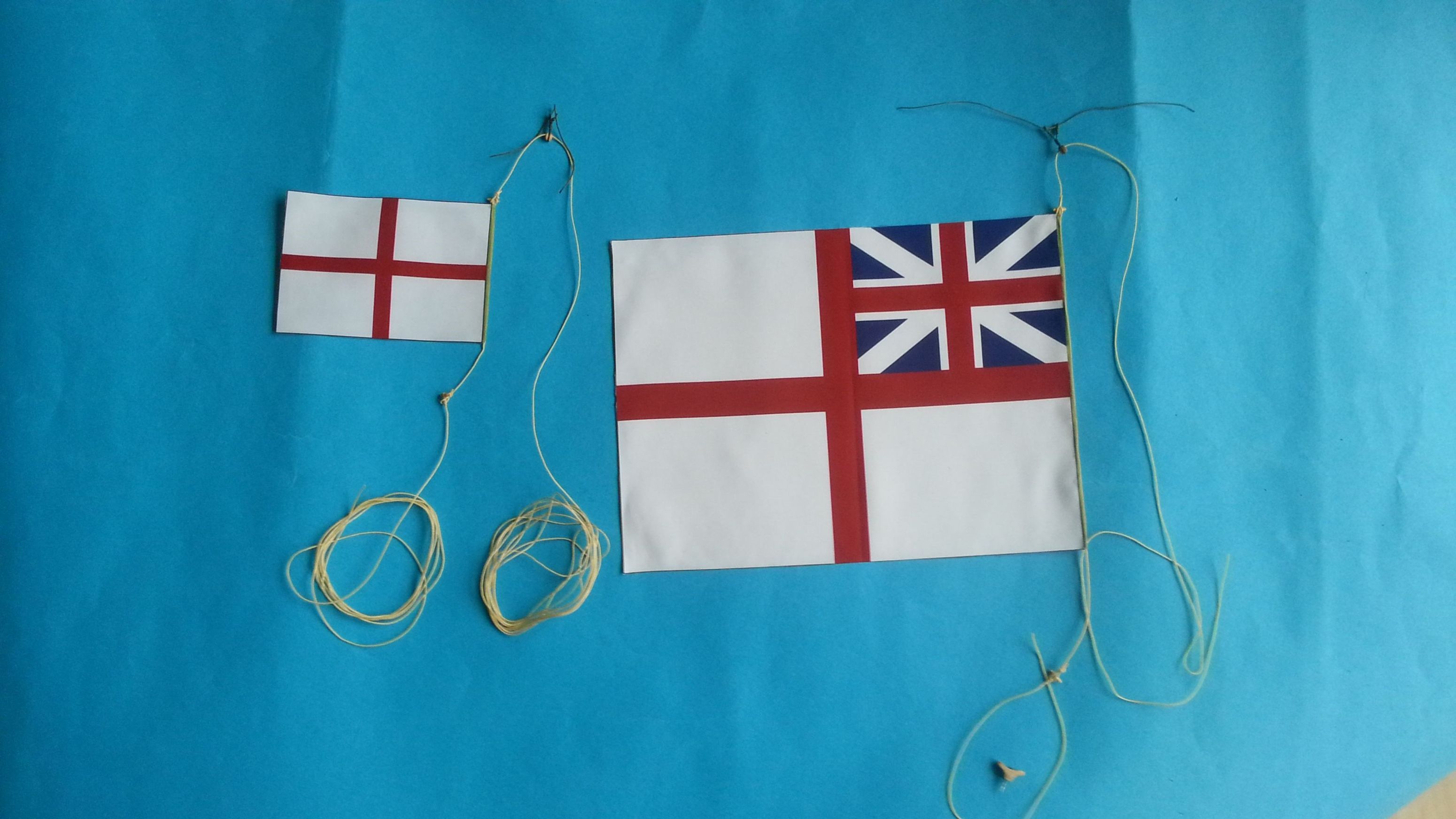 Pierwsza flaga o wymiarach 10 cm x 7 cm do zamontowania na topie grotmasztu i druga o wymiarach 22 cm x 16 cm zostanie zamontowana na gaflu.