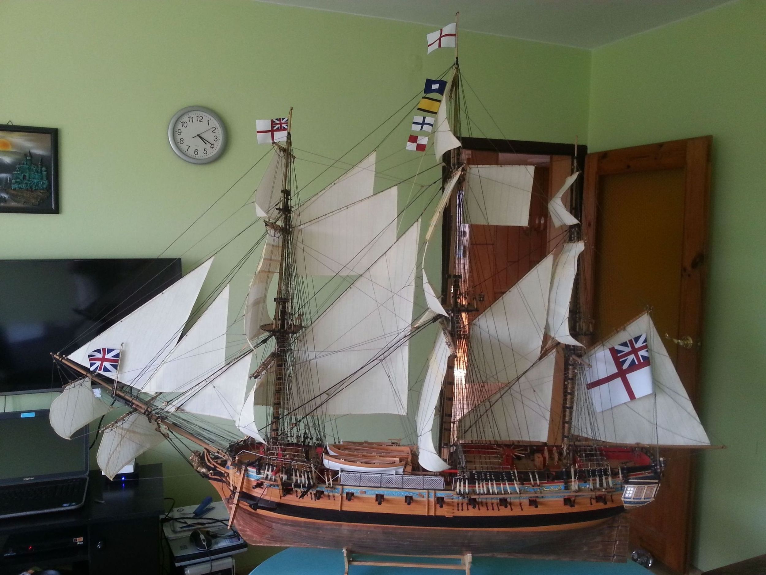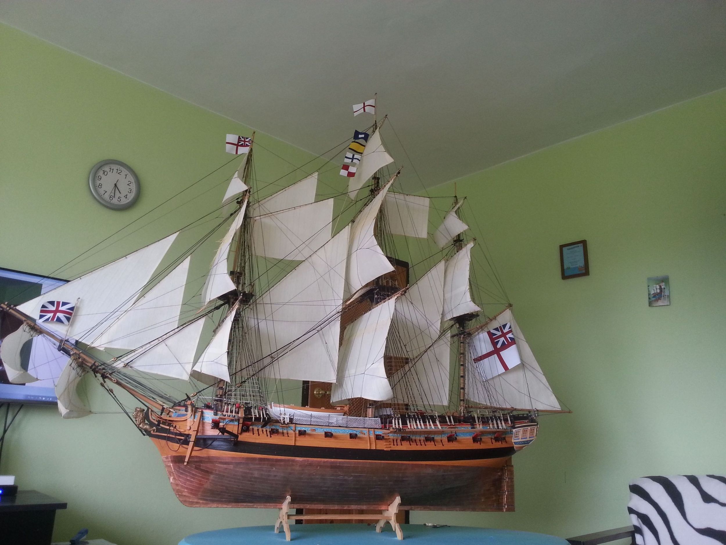 Znudziło mi się delektowanie lenistwem i wracam do modelowania. Zamontowałem flagi. Muszę jeszcze pozawieszać buchty na knagach i naglach. Zamocuję na stałe szalupy na pokładzie i zabieram się za gablotę.