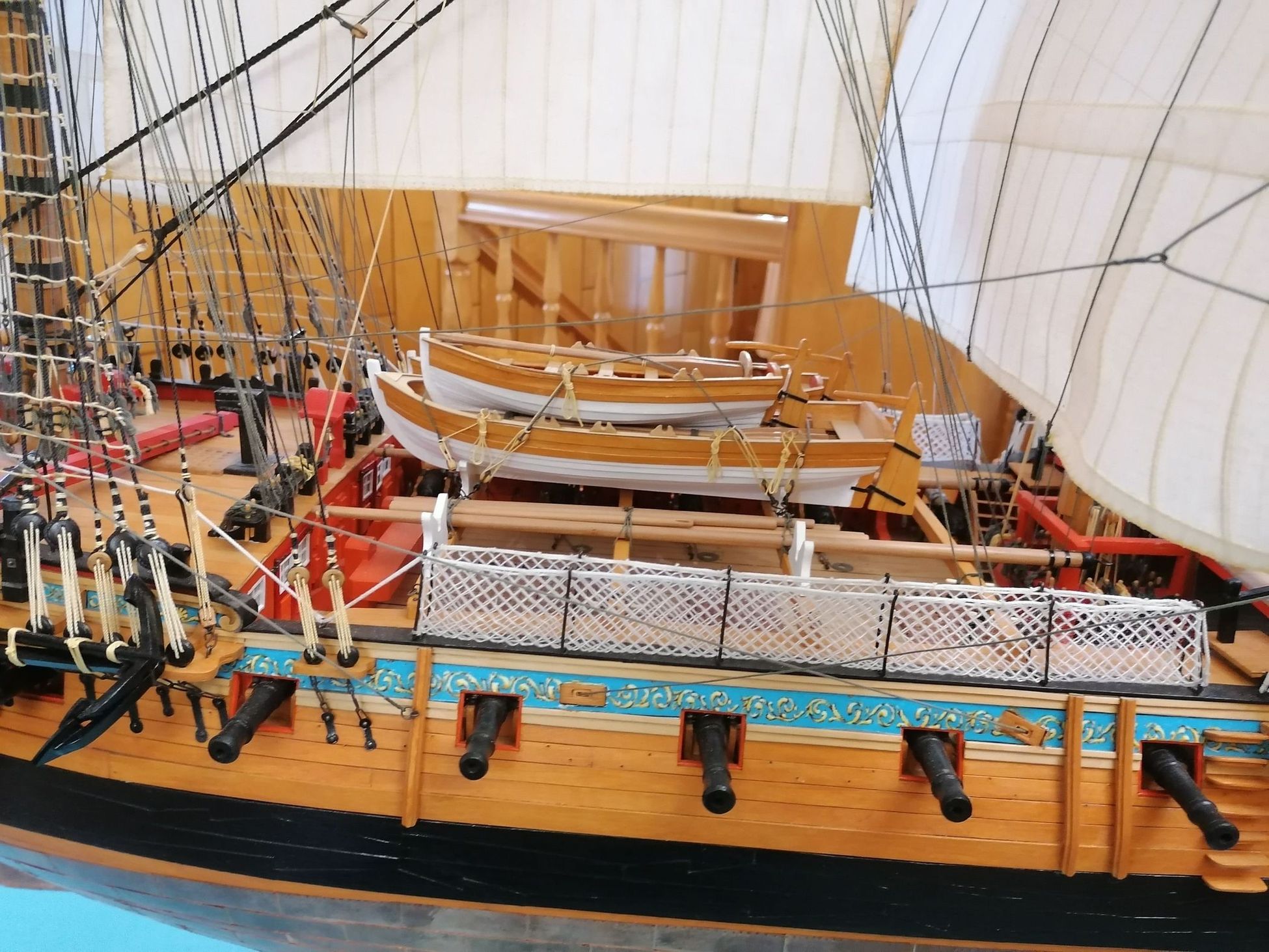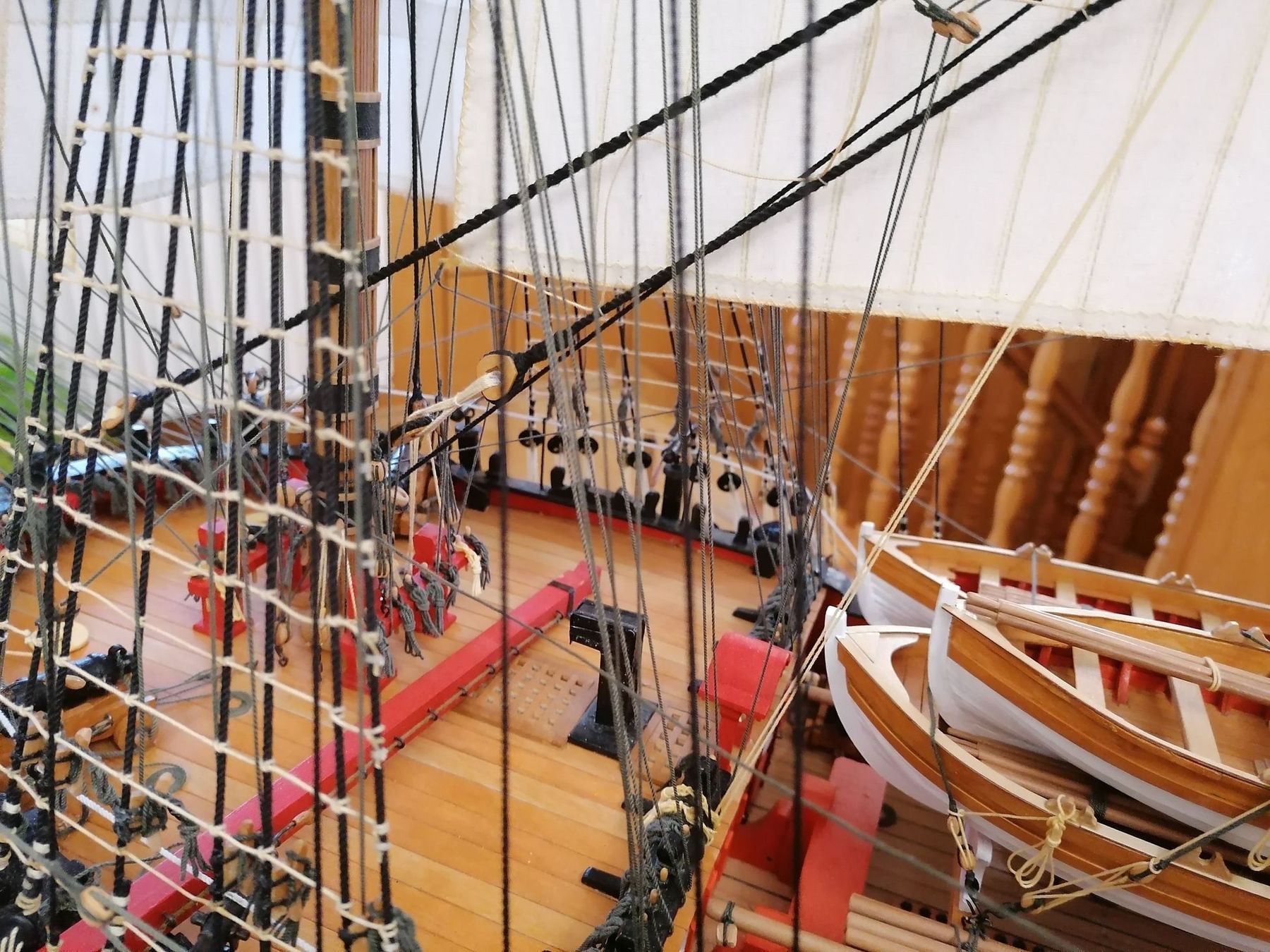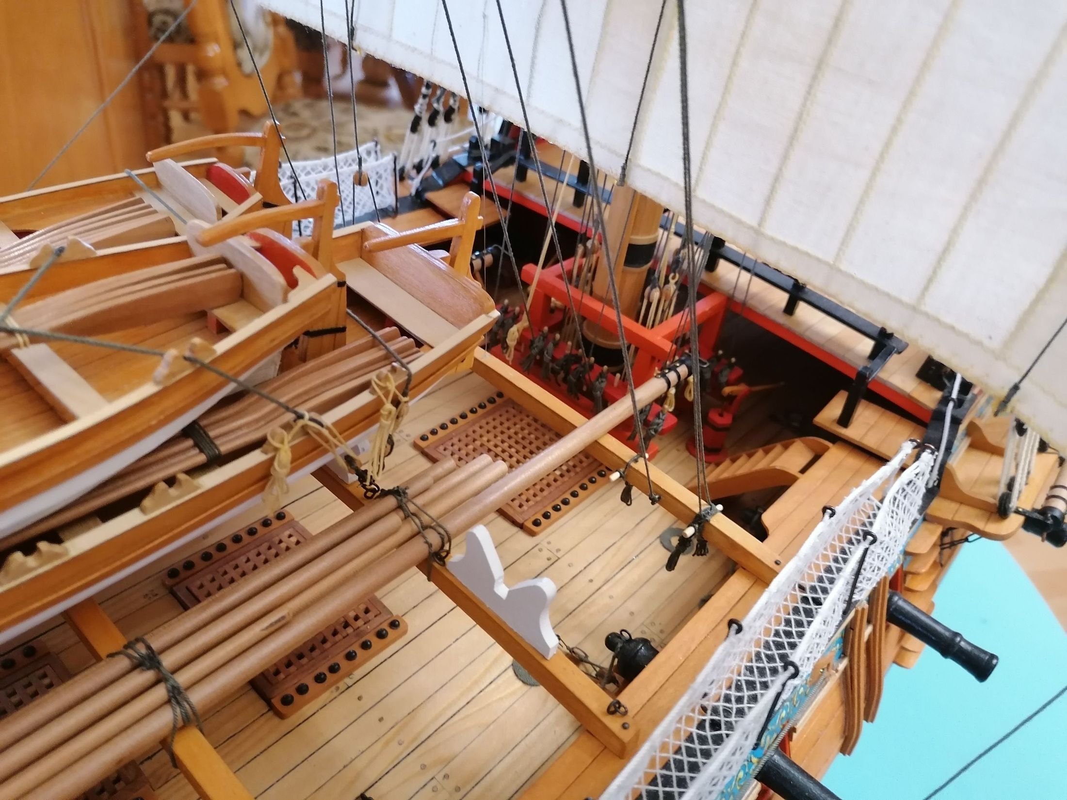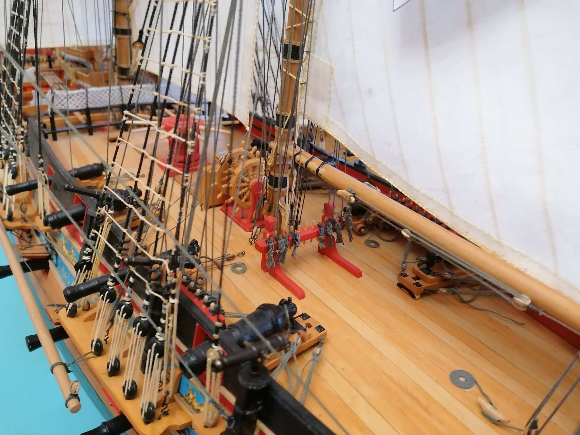 W sumie na moim modelu założyłem prawie 900 mb różnych linek. Kiedy to przeliczyłem na skalę 1:1 to okazało się, że na oryginalnym okręcie było prawie 30 km. Lin. Aż trudno w to uwierzyć, że załoga się w tej plątaninie lin nie pogubiła. To taka mała refleksja na koniec.