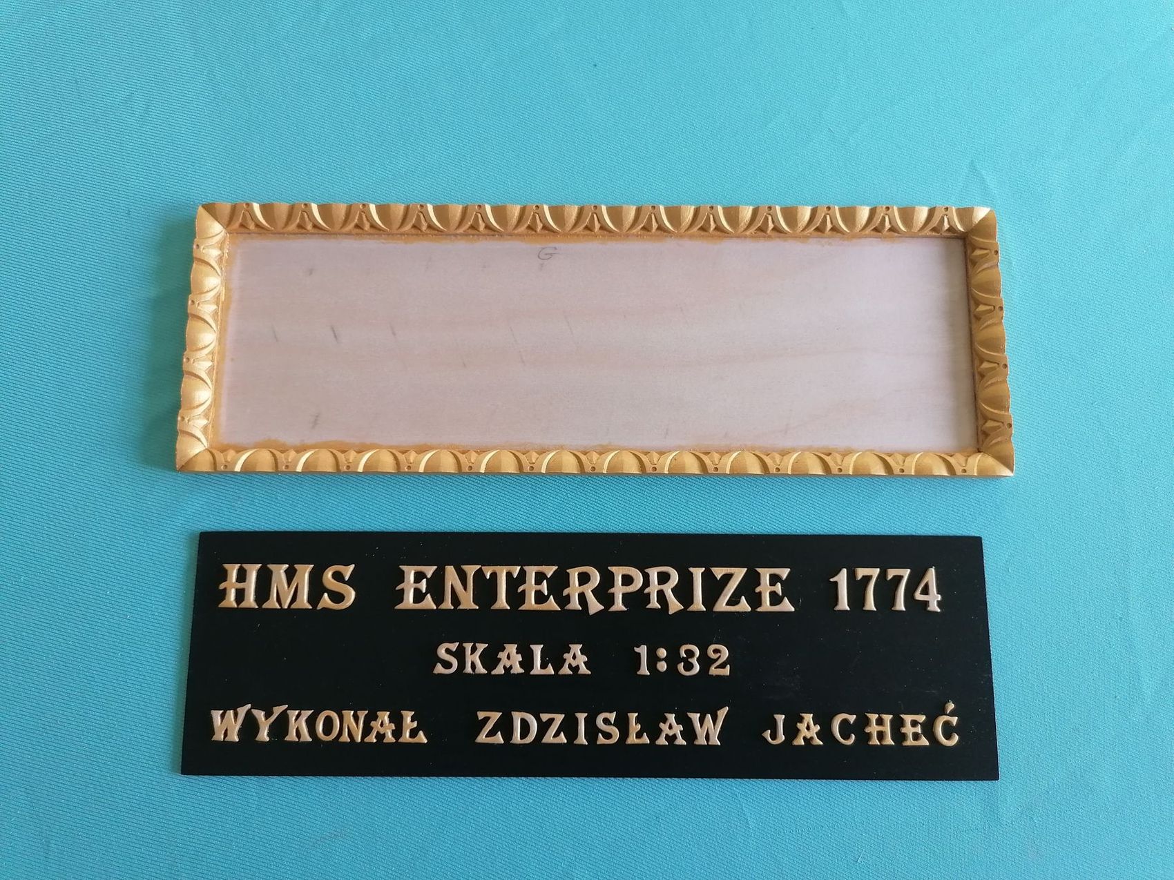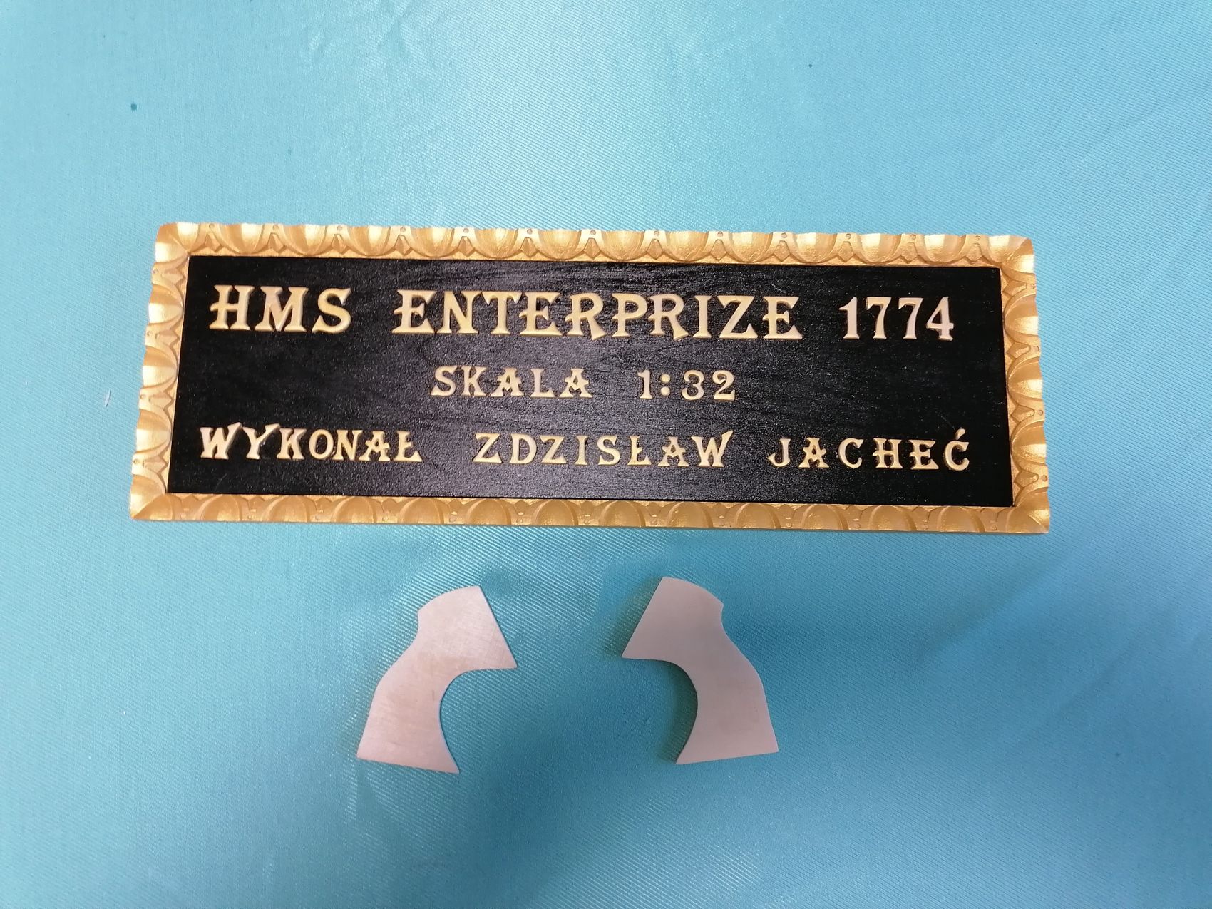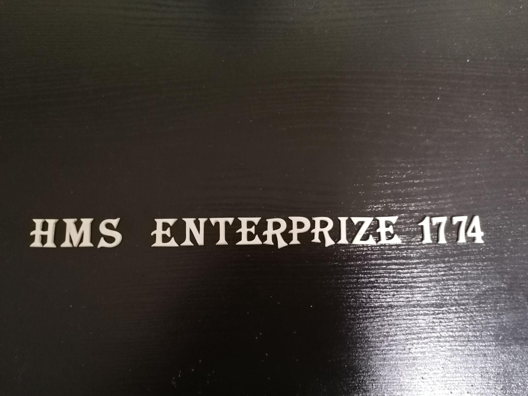 Moja przygoda z Enterprizem powoli zbliża się do finału. Zrobiłem sobie taką tabliczkę „znamionową”. Literki wydrukowałem na drukarce, następnie nakleiłem na 2 mm sklejkę.