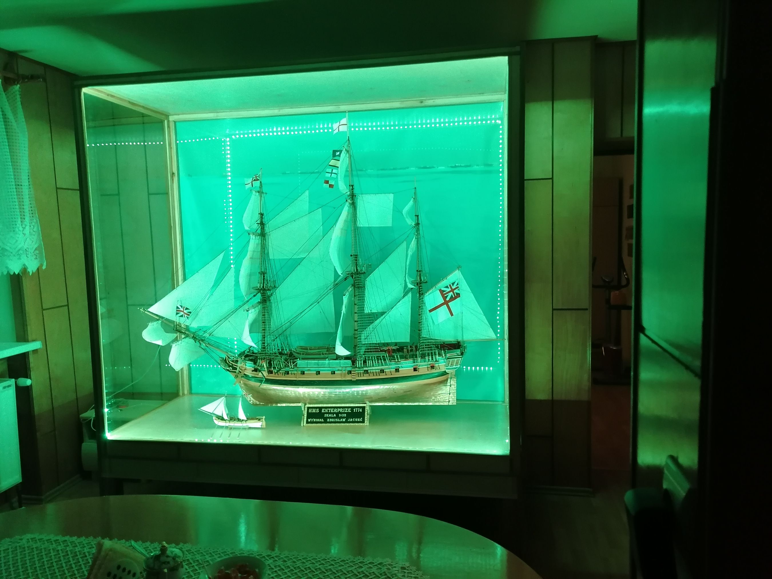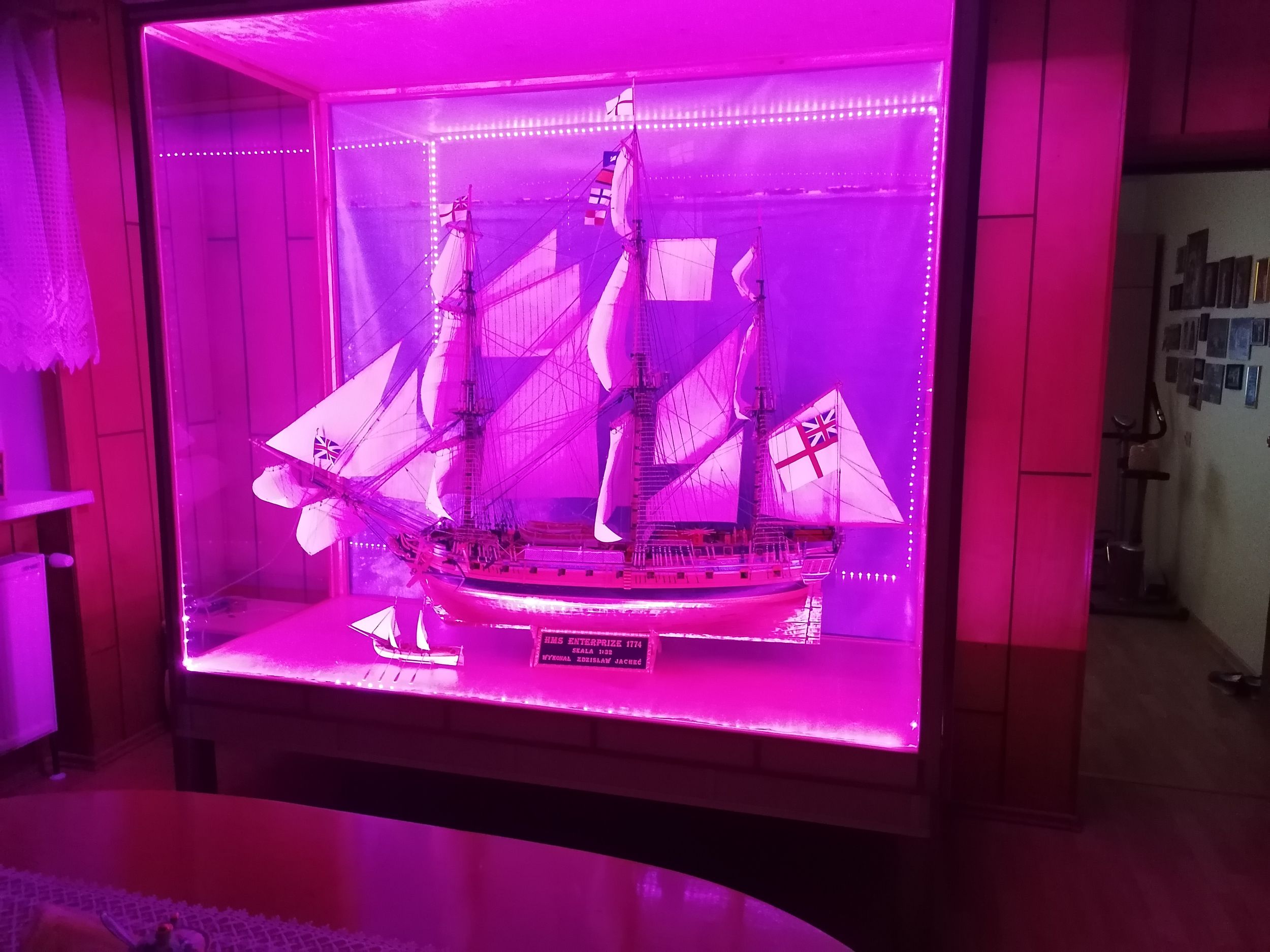 Model zajmuje sporo miejsca w holu, postanowiłem więc wykorzystać gablotę jako swego rodzaju "lampkę nocną". Zamontowałem więc w gablocie kolorowe ledy i w zależności od nastroju zmieniam kolor światła.