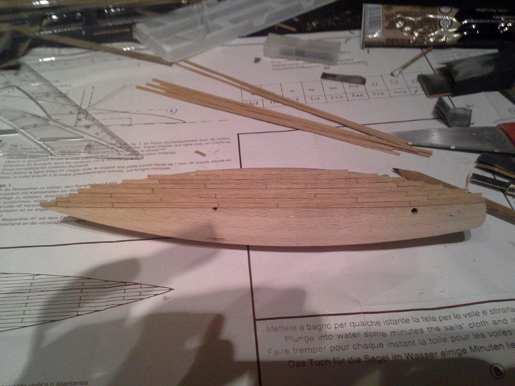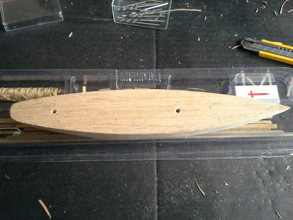 Dziękuję za konstruktywną krytykę. Faktycznie Twoje zdjęcie uświadomiło mi, że trzeba było rozpocząć układanie desek pokładu od wyznaczonej osi. Przeszlifowałem go jeszcze i przemalowałem kaponem, ale niewiele to pomogło. Tak już zostanie, jako nauka na przyszłość.