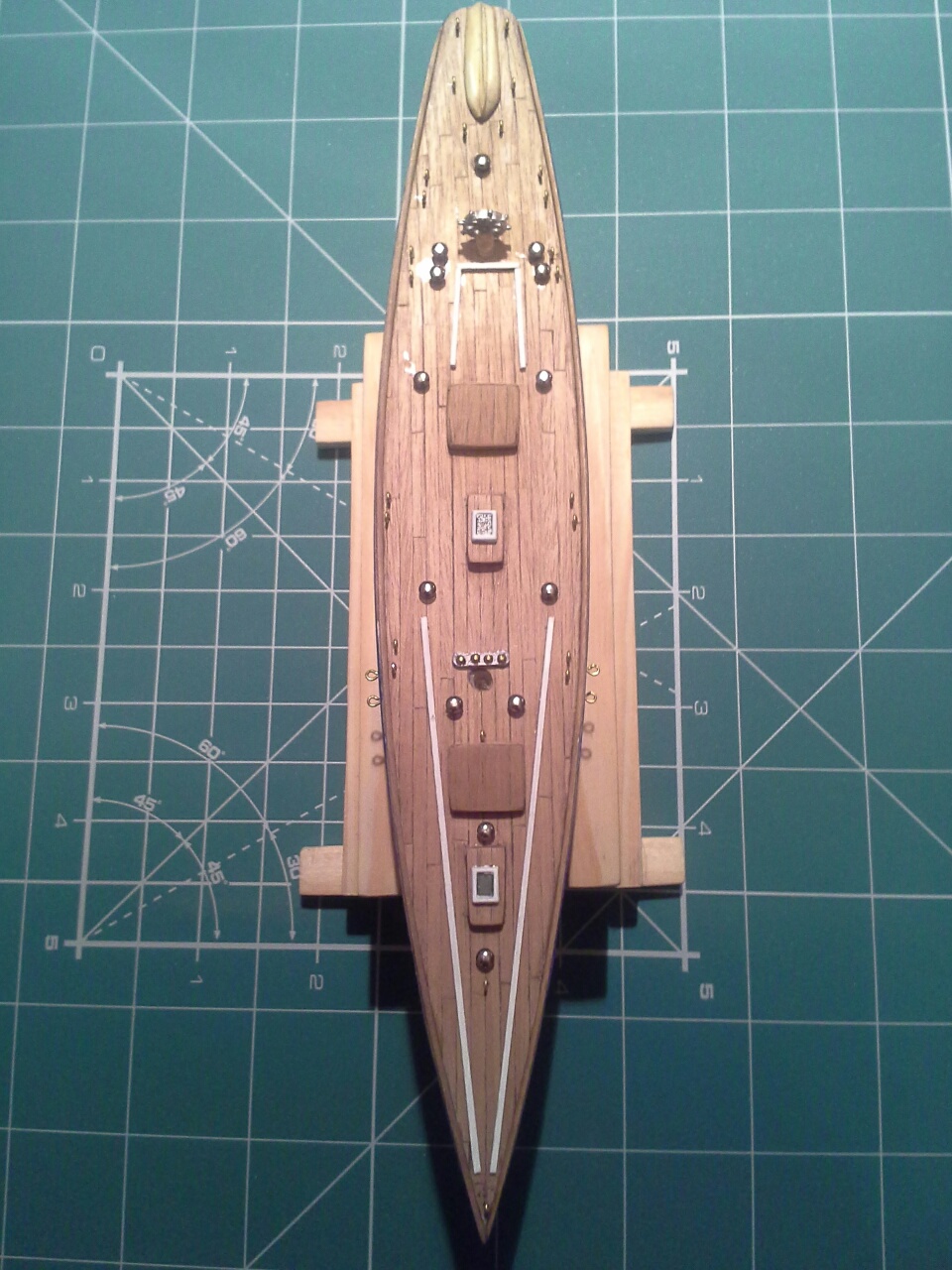 Dziękuję za konstruktywną krytykę. Faktycznie Twoje zdjęcie uświadomiło mi, że trzeba było rozpocząć układanie desek pokładu od wyznaczonej osi. Przeszlifowałem go jeszcze i przemalowałem kaponem, ale niewiele to pomogło. Tak już zostanie, jako nauka na przyszłość.