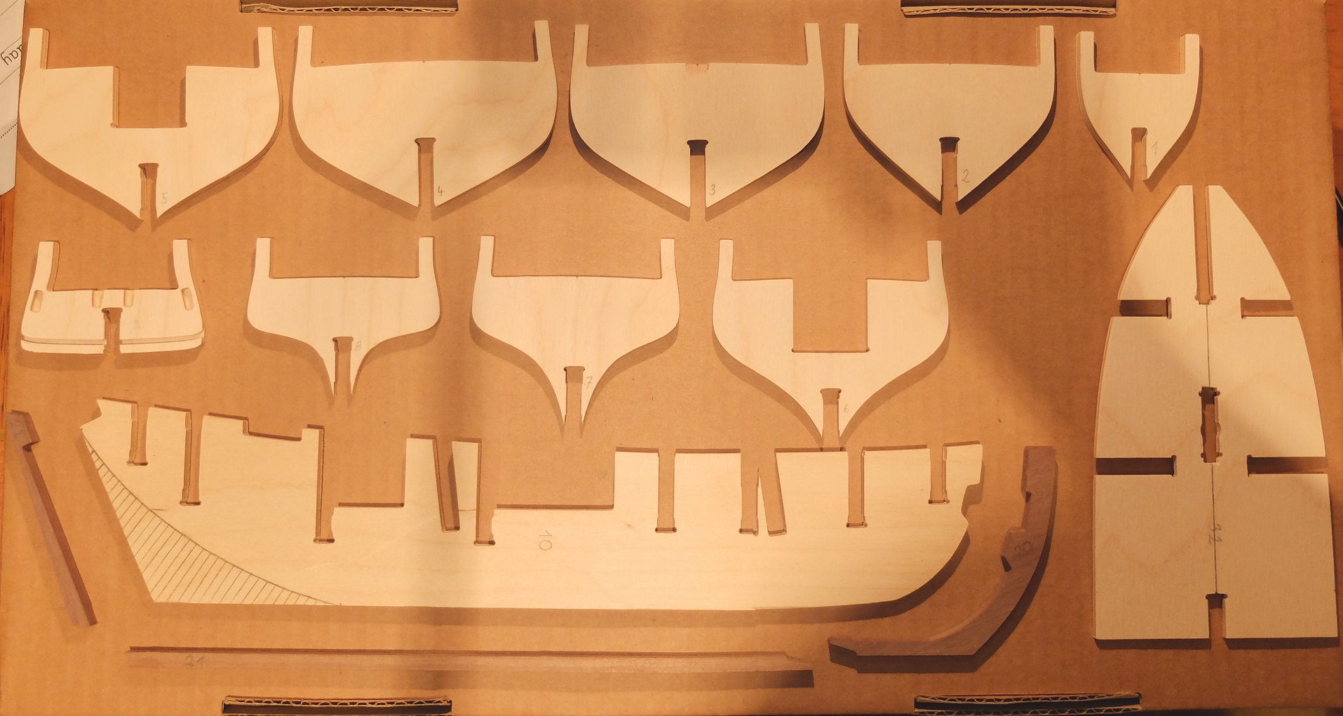 Warto zaznaczyć, że w kartonie znajdowała się znaczna ilość wiór, a i w szczelinach pomiędzy elementami a arkuszem, z którego zostały wycięte (techniką CNC) była ich cała masa. Nie wiedzieć dlaczego wcale się tego nie spodziewałem. Po wyjęciu wszystkich elementów wysypałem zmieszane wióry do śmietnika, a te które były na arkuszach delikatnie powydłubywałem ze szczelin. Utworzyłem kupkę wiór dębowych i kupkę wiór ze sklejki i przesypałem każdą z nich do małych plastikowych pojemników. Słyszałem, że wiórki mogą się przydać do obfitego zmieszania z klejem jak trzeba będzie wypełnić jakieś ubytki. Nie wiem ile w tym prawdy. Może mi powiecie?