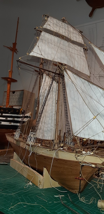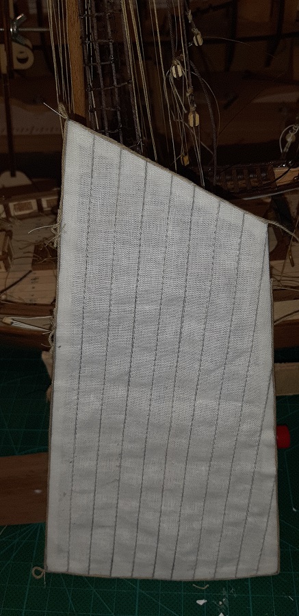 Wykonałem wszyściuteńkie odciągi fokmasztowego wyższego głównego żagla. Zabrałem się też za klejenie likliny do foka.