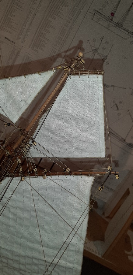 Wykonałem wszystkie odciągi gafla, a zarazem też wszystkie żagle. Teraz tylko buchty :twisted: i bandera.