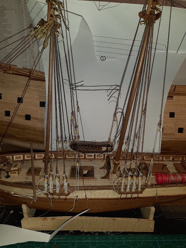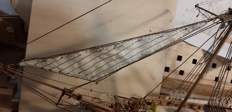 Kończąc żagiel, nie mogłem się powstrzymać by go zawiesić :D , tak samo z reją, tyle że ja jeszcze zdejmę bo zapomniałem dać tam bloczka który jest potrzebny mechanizmowi podnoszenia szalupy.