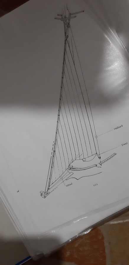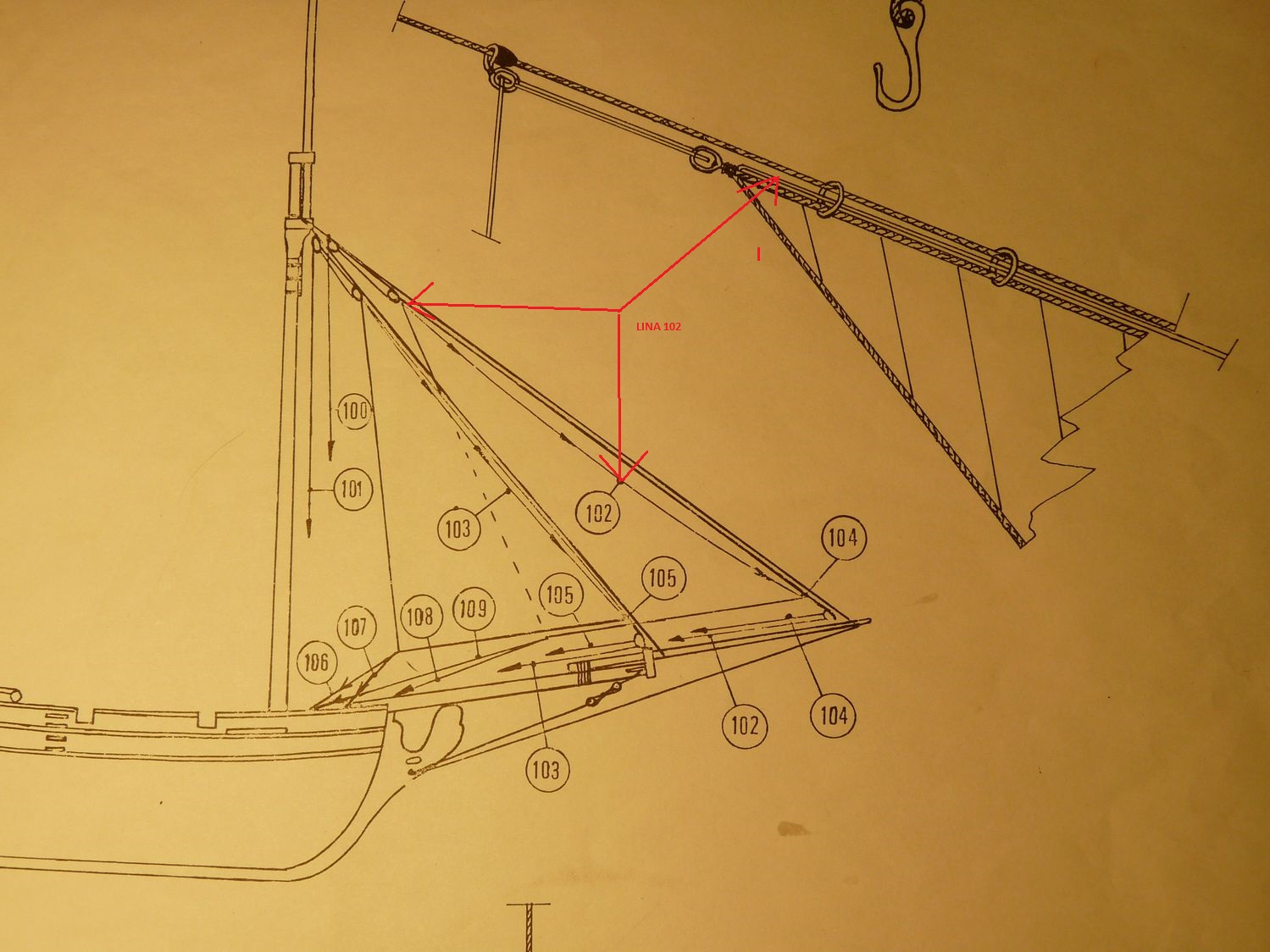 Nie widziałem Twoich planów, ale wydaje mi się, że masz błąd. Na bukszprycie powinieneś mieć nie pojedyncze, ale podwójne bloki. Zwróć uwagę na rysunki podobnego szkunera, wydaje mi się, że brakuje Ci liny 104 która obok liny 102 powinna przechodzić przez podwójny blok i dalej na pokład do nagli.