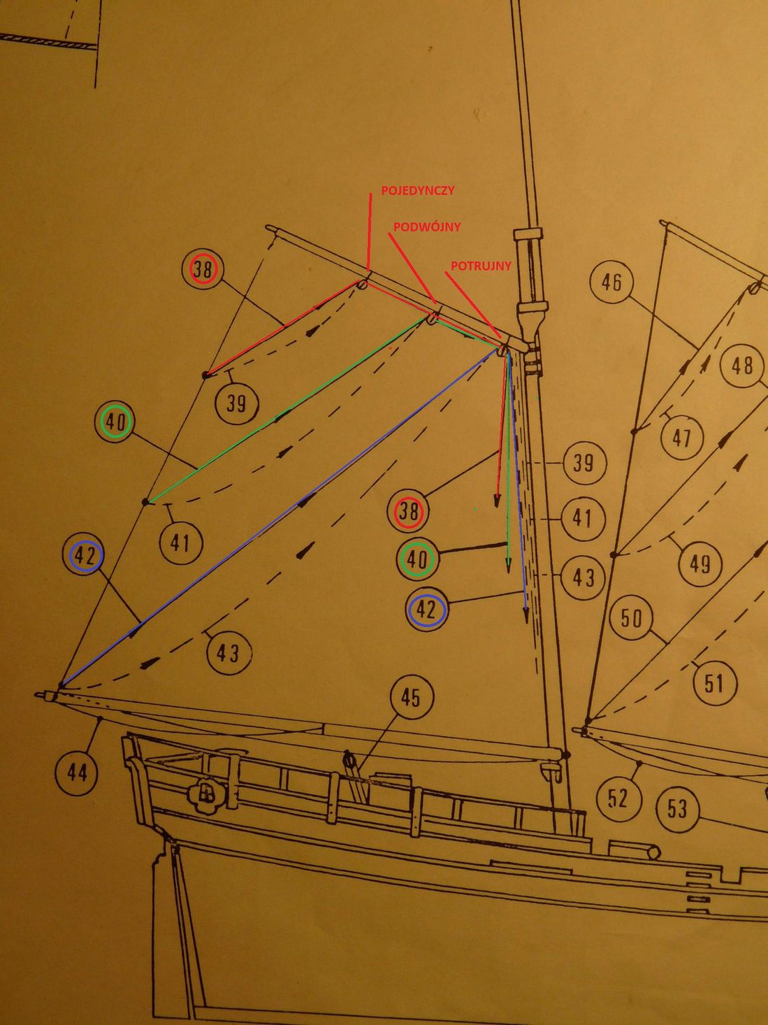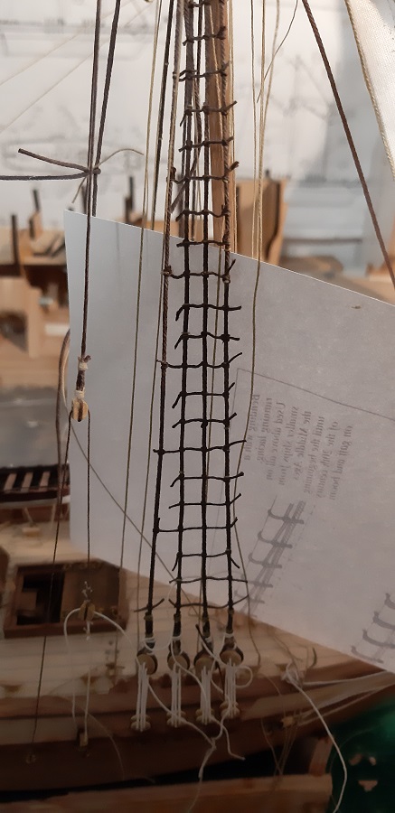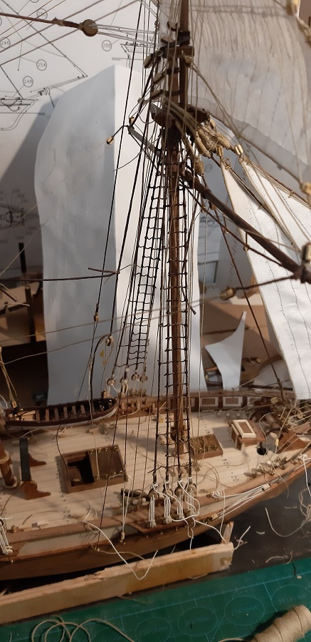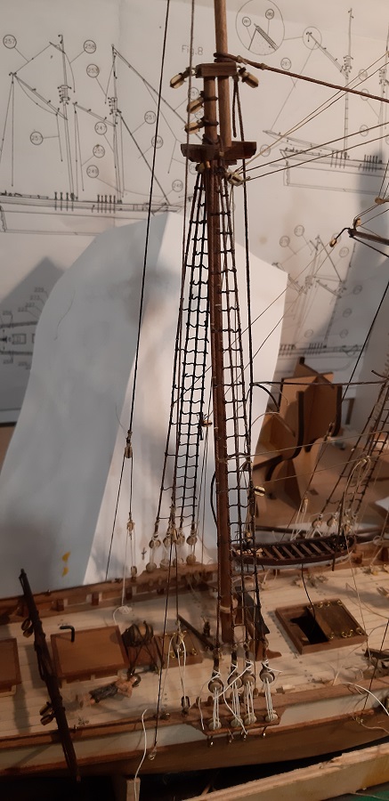 Wykonałem wszystkie odciągi głównego żagla fokmasztu.