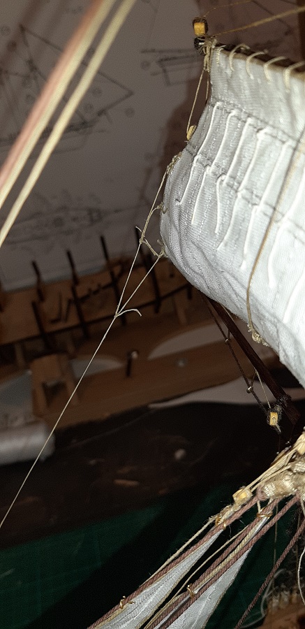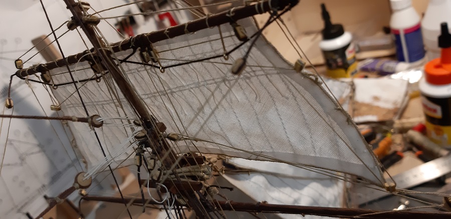 Wykonałem wszyściuteńkie odciągi fokmasztowego wyższego głównego żagla. Zabrałem się też za klejenie likliny do foka.