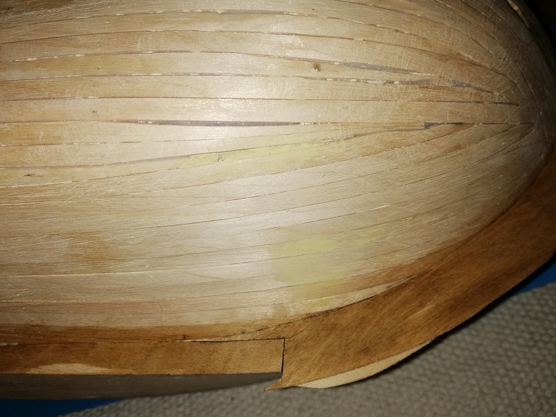 Sorry, że muszę Cię rozczarować, ale położyłeś poszycie błędnie - typowo dla początkującego. Poza tym, rufa u Ciebie zachodzi na poszycie, a powinno być odwrotnie.