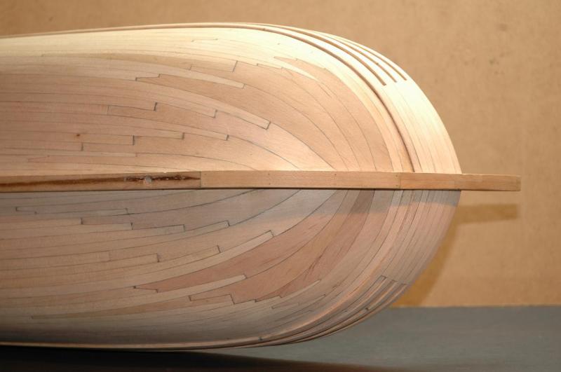 Trzeba sobie najpierw dokladnie poprzeliczac na najbardziej pekatej wredze w srodokreciu, ile tam zmieszcze moich planek (dobrze sobie wprzod podzielic cala burte na kilka eliptycznego ksztaltu pasow i wyliczac te ksztalty planek w obrebie kazdego pasa). Potem to samo zrobic z pozostalymi wregami - oczywista na tamtych szerokosc kazdej z planek bedzie sie stopniowo zmniejszac by zmiescic je tam wszystkie. Nie musze chyba wspominac o idealnej symetrycznosci obu burt!