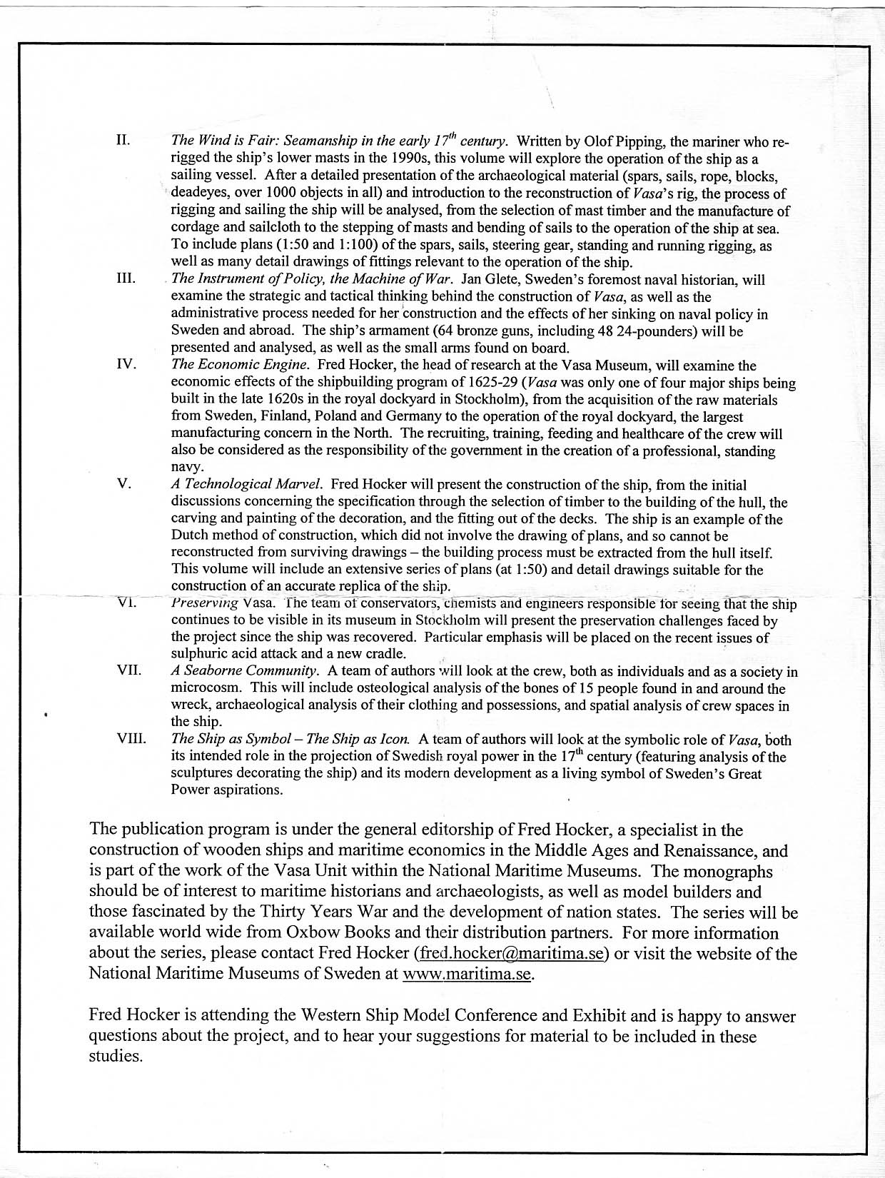 Ta druga pozycja, to- jak do tej pory, tylko tom 1-szy z planowanej serii osmiu superdokladnych monografii o Vasie. Czy i kiedy ukaze sie reszta, nie wiadomo. Cala seria miala byc opracowana pod kierunkiem wspomnianego juz Freda Hockera, ktory jest kustoszem muzeum Vasy w Sztokholmie i jednoczesnie dyrektorem d.s. badan historycznych tamze. Facet o ogromnej wiedzy ogolnoszkutniczej, a zwlaszcza dotyczacej Vasy. Mialem przyjemnosc kiedys wysluchac jego wykladu o Vasie na jednej z konferencji Western Ship Model Conference & Exhibit w Long Beach. Dawne czasy...