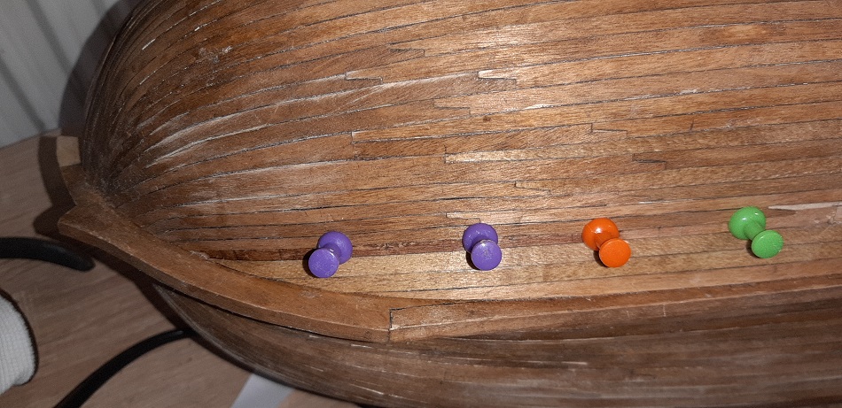 Ukończyłem poszywanie na jednej z burt w części podwodnej. Efekt dla mnie jest b.dobry, choć jestem świadom, że dało się zrobić to lepiej.