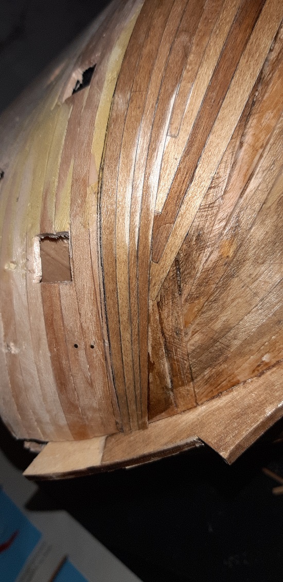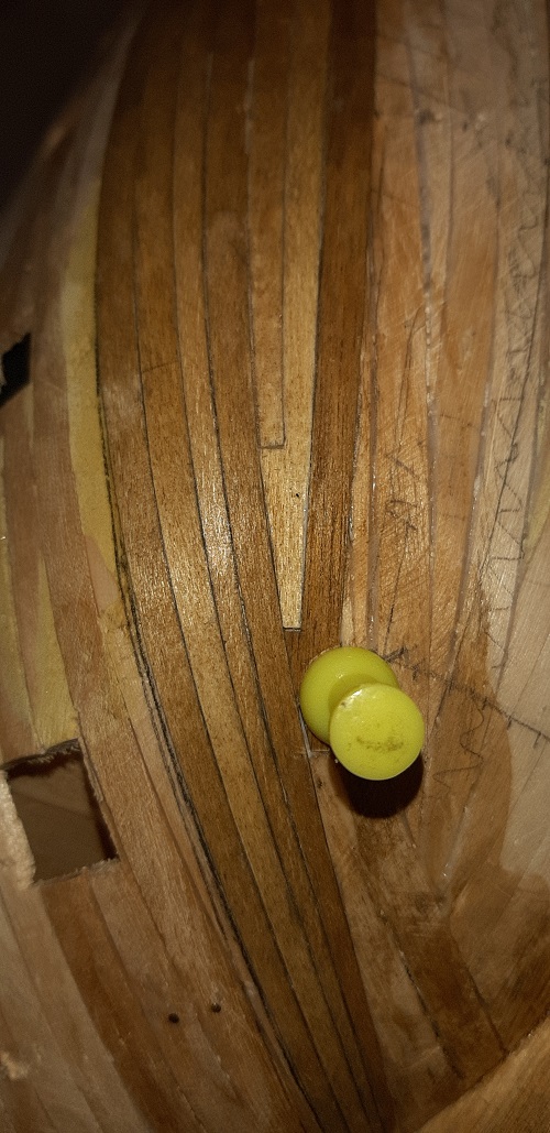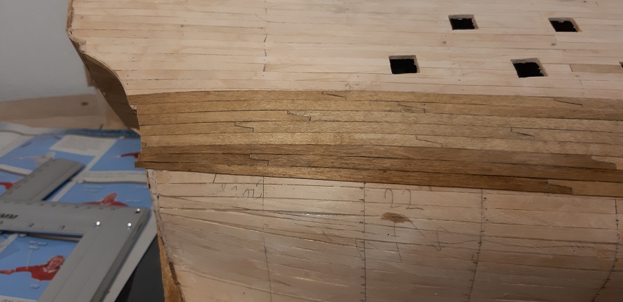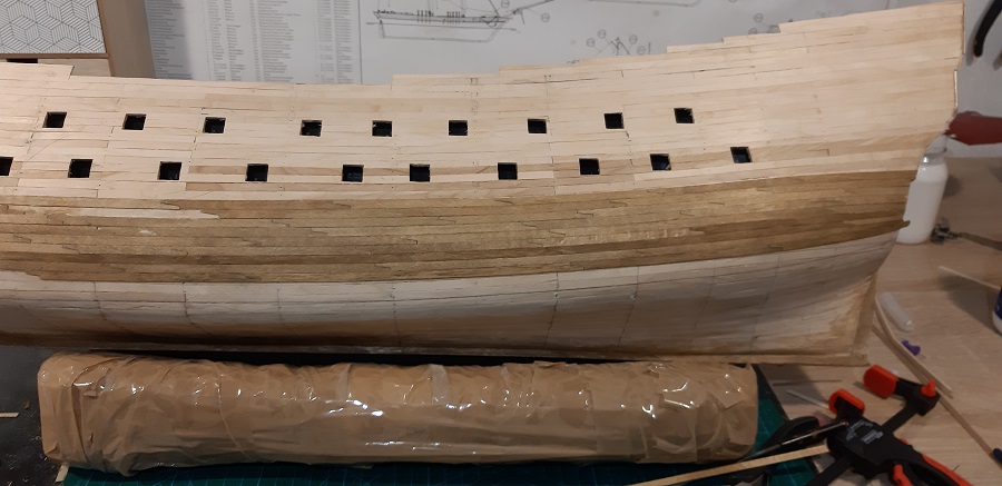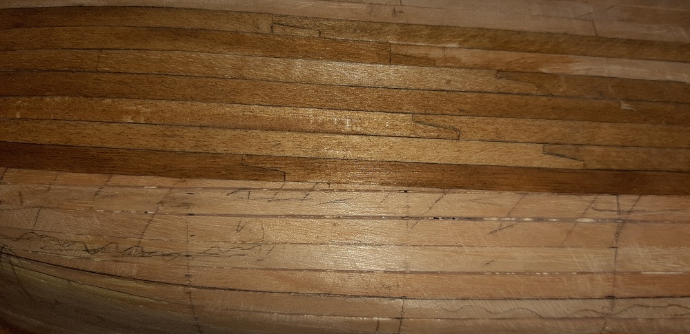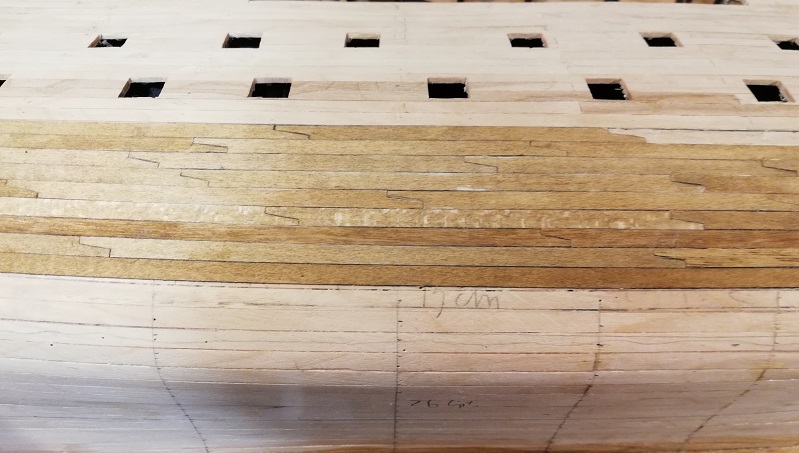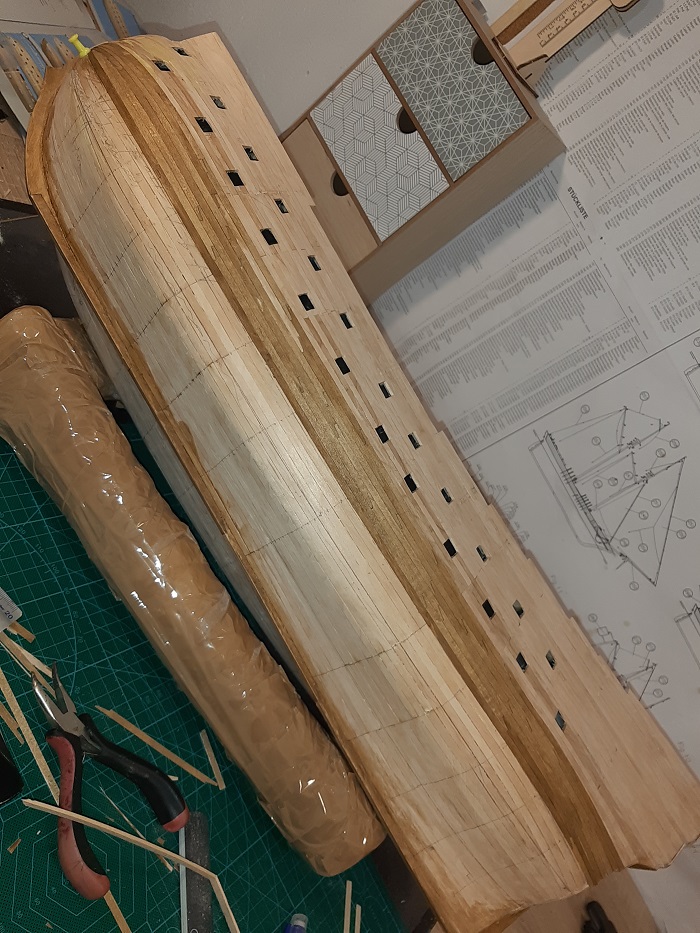Właściwie nic się prawie nie zmieniło, doszedł tylko 1 rząd na jednej z burt i zacząłem kolejny na przeciwnej. I za radą kolegi z MSW zabejcowałem dziób na ciemny kolor, by nie było widać ewentualnych prześwitów. https://modelshipworld.com/index.php?/t ... stini-165/