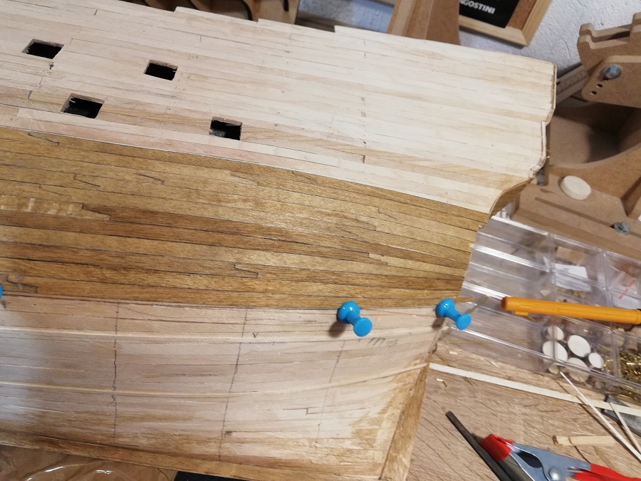 Cześć. Próbujesz wygiąć pasek forniru w części dziobowej przed przyklejeniem? Ja tak robiłem przy Smoku, a też ma dość "kulisty" kształt dziobu.