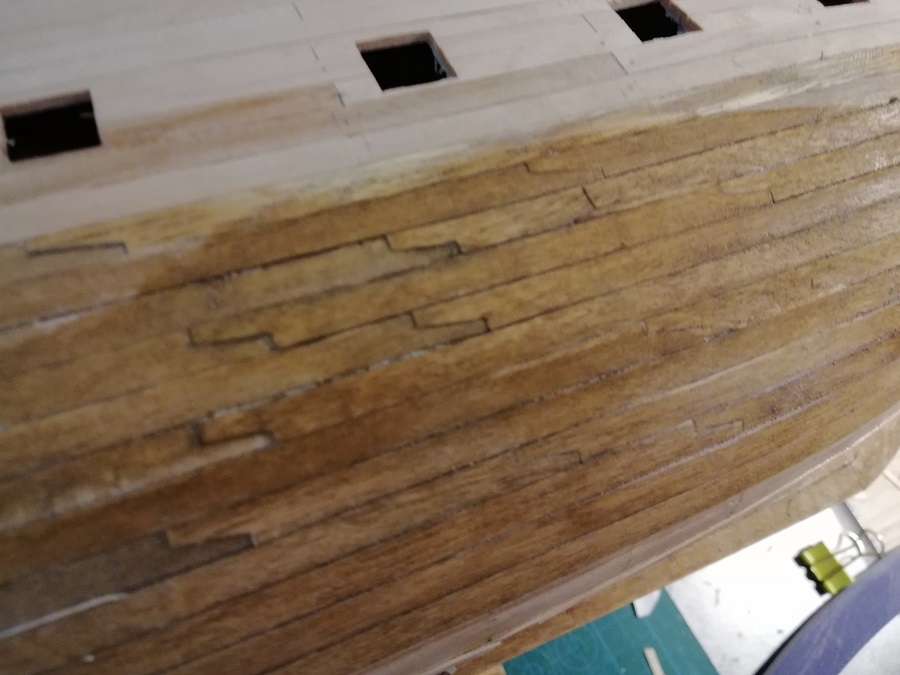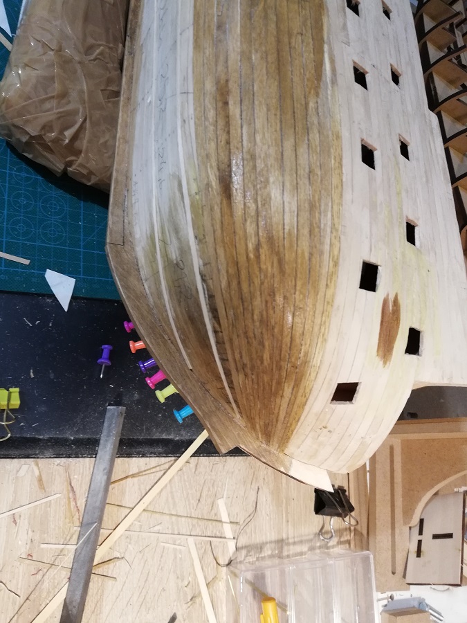 I przy okazji próbnie zeszlifowałem i nadałem kolorku, "schodki" są prawie zniwelowane, a wybrzuszenia na dziobie zniknęły. (bejca nie wyschła!)