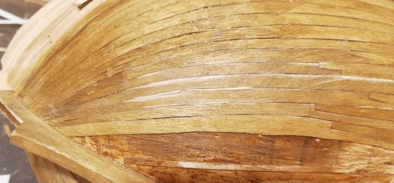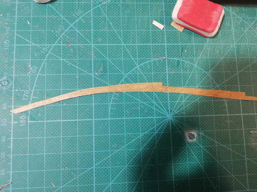 A co do poszywania kadluba modelu okretu o "tepym dziobie", mozna probowac plankami prostymi, najpierw je profilujac (spiling) wg. ogolnie przyjetej metody, a potem, namoczywszy tak wyprofilowane planki w letniej wodzie na kilka minut, probujac je wyginac goracym zelazkiem, lub kolba do lutowania z odpowiednia koncowka, albo tez specjalnym narzedziem do wyginania planek na goraco (zdaje sie, ze Artesania Latina i Aeropiccola jeszcze sprzedaja toto), starajac sie wyginac planke poza modelem, na deseczce, w dwoch plaszczyznach, tj. ku gorze i jednoczesnie bocznie, czesto sprawdzajac ksztalt na kadlubie. Takie wyginanie na goraco pozwoli do pewnego stopnia na wygiecie takze i boczne. Jesli zaistnieje jednak koniecznosc wiekszego niz dopuszczalne ta metoda wyginania bocznego, a listewka peka, trzeba uciec sie do przygotowania sobie odpowiedniego ksztaltu polkiezycowatego szablonu z bristolu i dopiero potem przeniesc ten szablon na drewniana listewke - planke do poszycia. Ten proces jest z detalami wyjasniony na forum Modelshipworld, przez Davida Antscherla czy tez przez Chucka Passaro, w dziale Links, tutaj: