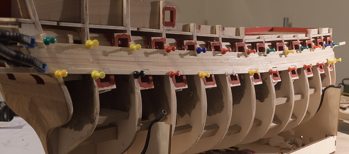 Przy listewkach na poszycie o grubosci 2 mm, wystarczy, po wstepnym ich wyprofilowaniu (spiling), najpierw namoczyc Twe listewki w letniej wodzie przez ok. pol godziny i potem nadac im odpowiednia krzywizne metoda "na goraco". Jedni uzywaja zelazka, drudzy suszarki do wlosow ksztaltujac listewke w palcach, czy damskiej lokowki, ja uzywam niezbyt goracej (by nie spalic drewna) kolby do lutowania z odpowiednia koncowka z aluminium lub mosiadzu, ktora wyginam kazda listewke do ksztaltu mozliwie takiego by ona lezala luzem na kadlubie idealnie lub prawie idealnie. Nie trzeba wowczas duzej sily wyginajacej, dociskajacej listewke (planke) do wreg (grodzi) - stad stosowanie jakichs wymyslnych wkretow czy gwozdzikow nie jest konieczne. Ja uzywam do tego zwyklych stalowych szpilek krawieckich z duzymi kolorowymi lebkami (by latwiej je uchwycic palcami) i delikatnie je wbijam malym mloteczkiem w krawedzie grodzi - wystarcza 3 lub 4 stukniecia mloteczkiem tak, aby szpilka ledwie 'chwycila' i nie rozwarstwila ich. I nie wbijam je przez planke (bo zostawi tam dziurke) a raczej tuz przy jej krawedzi, po dokladnym docisnieciu palcami planki do krawedzi sasiadujacej z nia planki. Zalecane jest tez podlozenie miedzy szpilke a montowana planke malego klinika z drewna, kawalka z zapalki czy wykalaczki, by zapobiec odcisnieciu na wilgotnej plance okraglego wycisku od szpilki.
