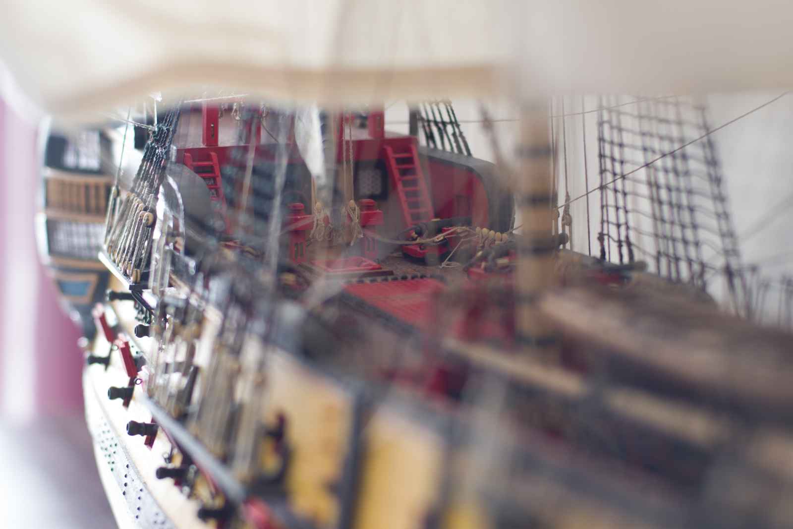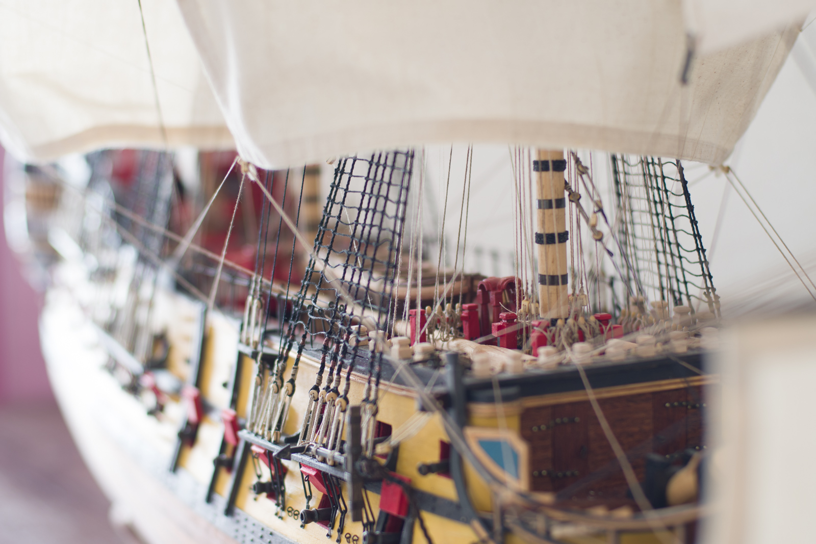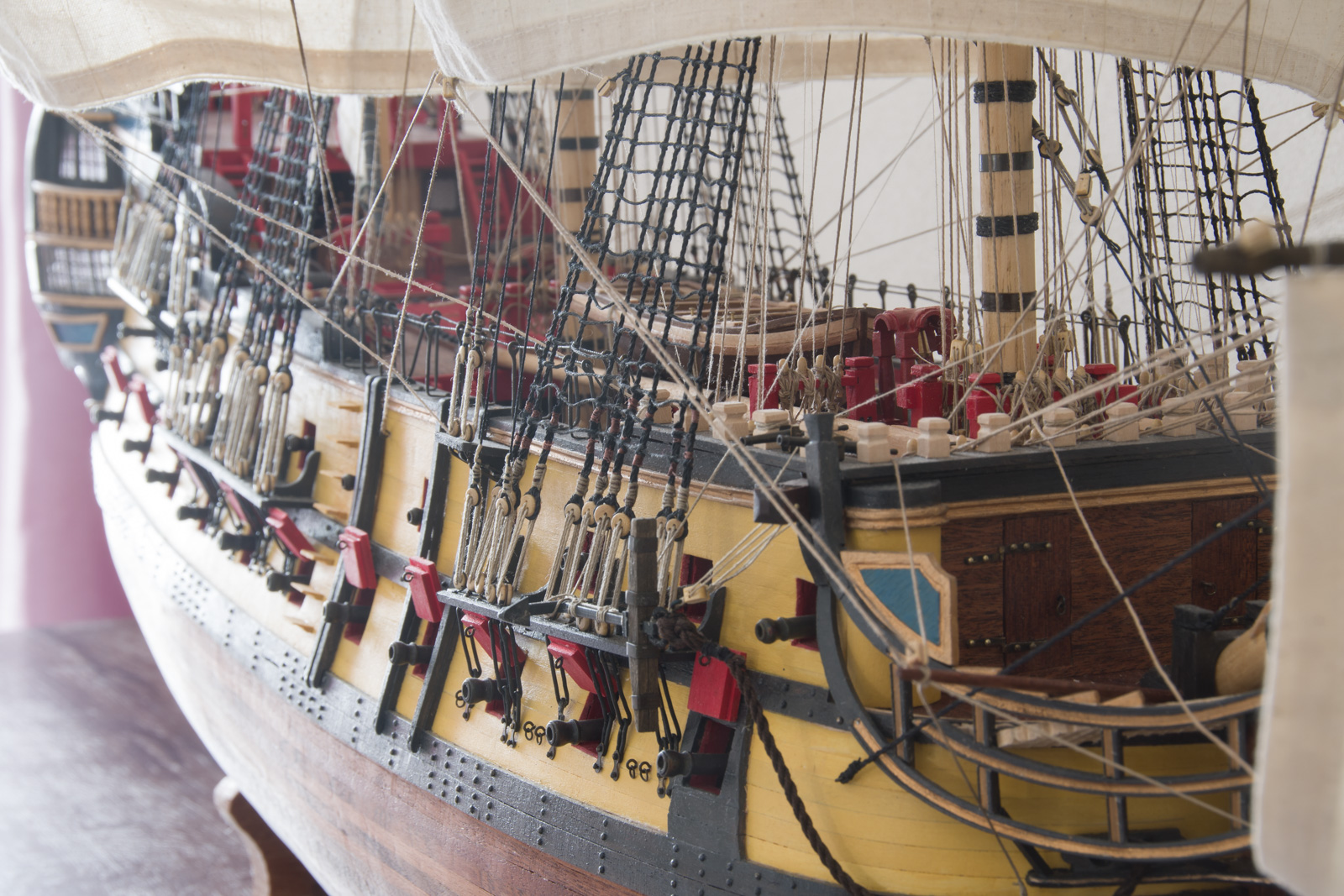 A tymczasem zbliżamy się do portu. Wyblinki wreszcie powiązałem i jeszcze trochę olinowania stałego, przymocowałem kotwice, a może coś tam więcej. Teraz rozwiązywanie łamigłówki pozostałego olinowania. Muszę przyznać, że Wasze rysunki są "trochę" dokładniejsze