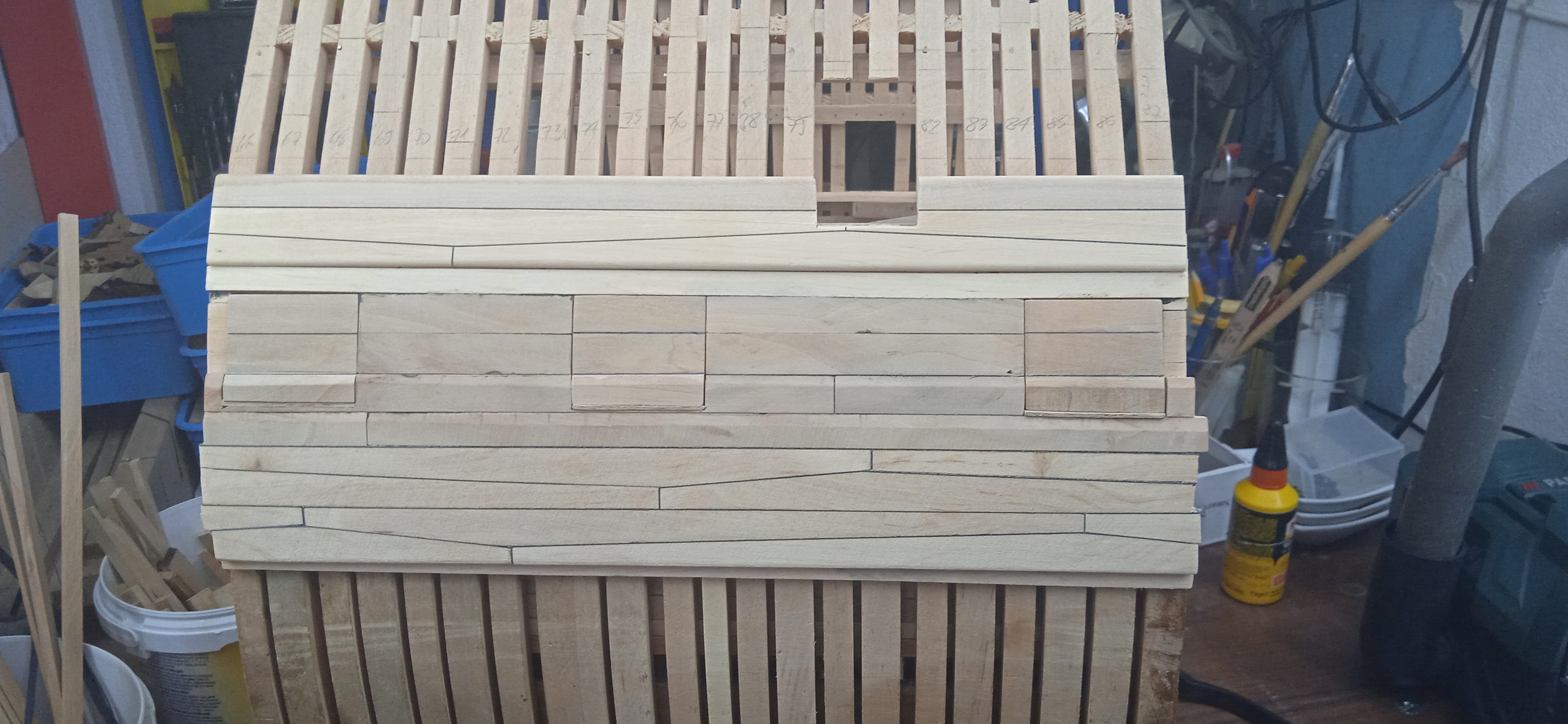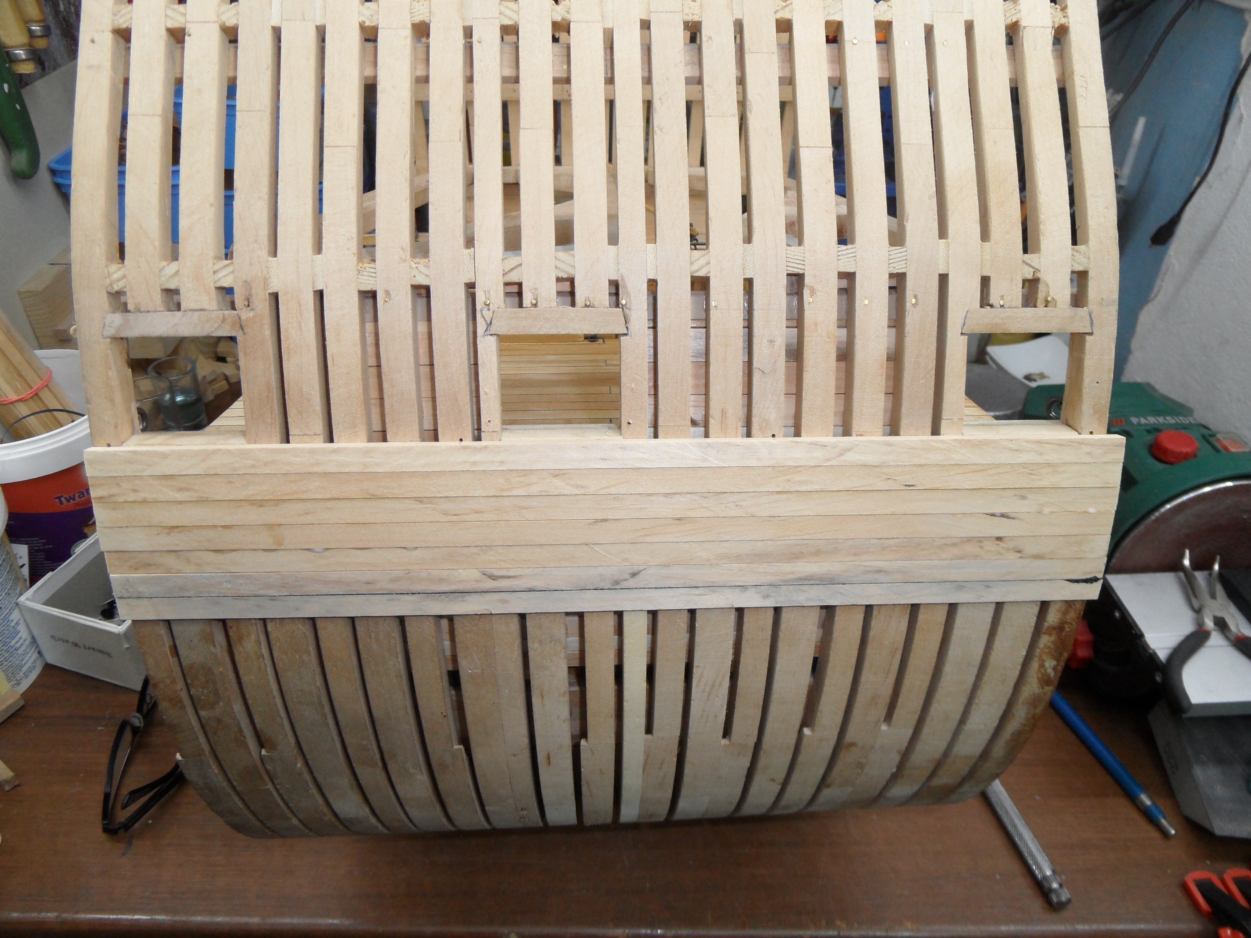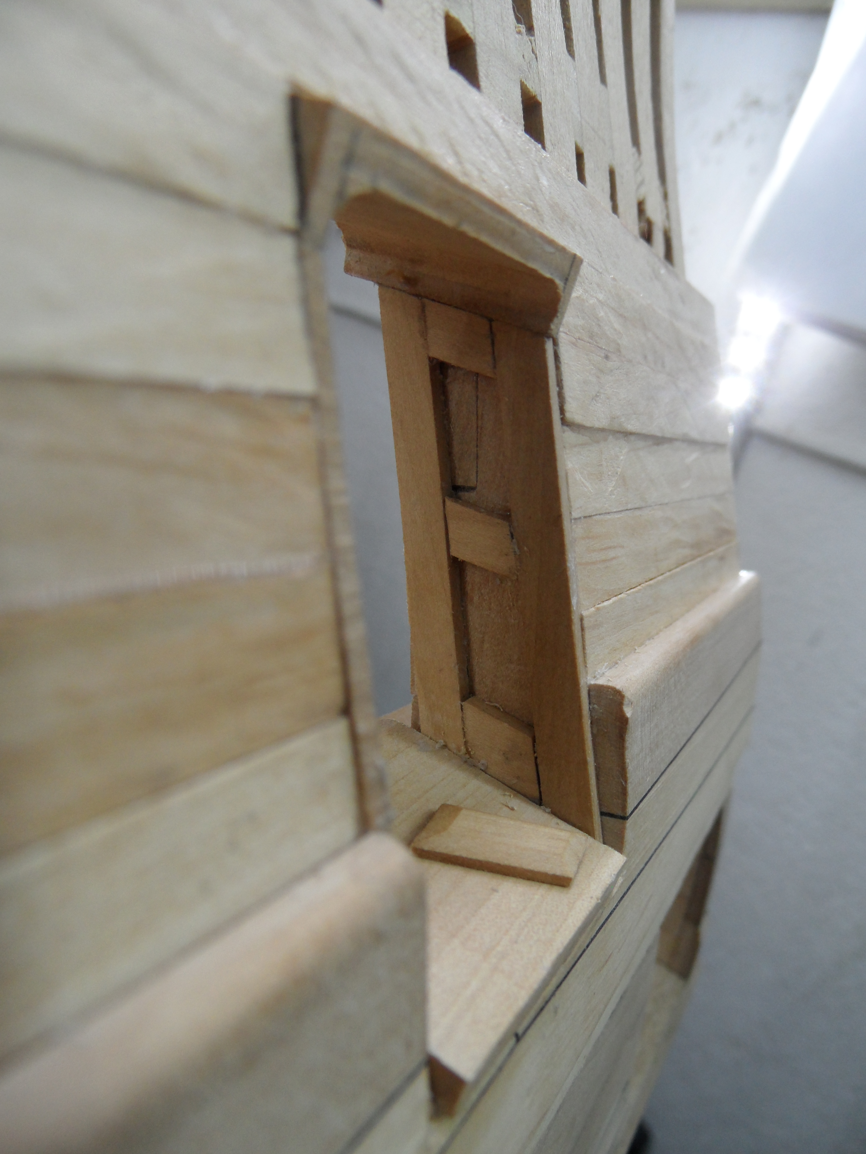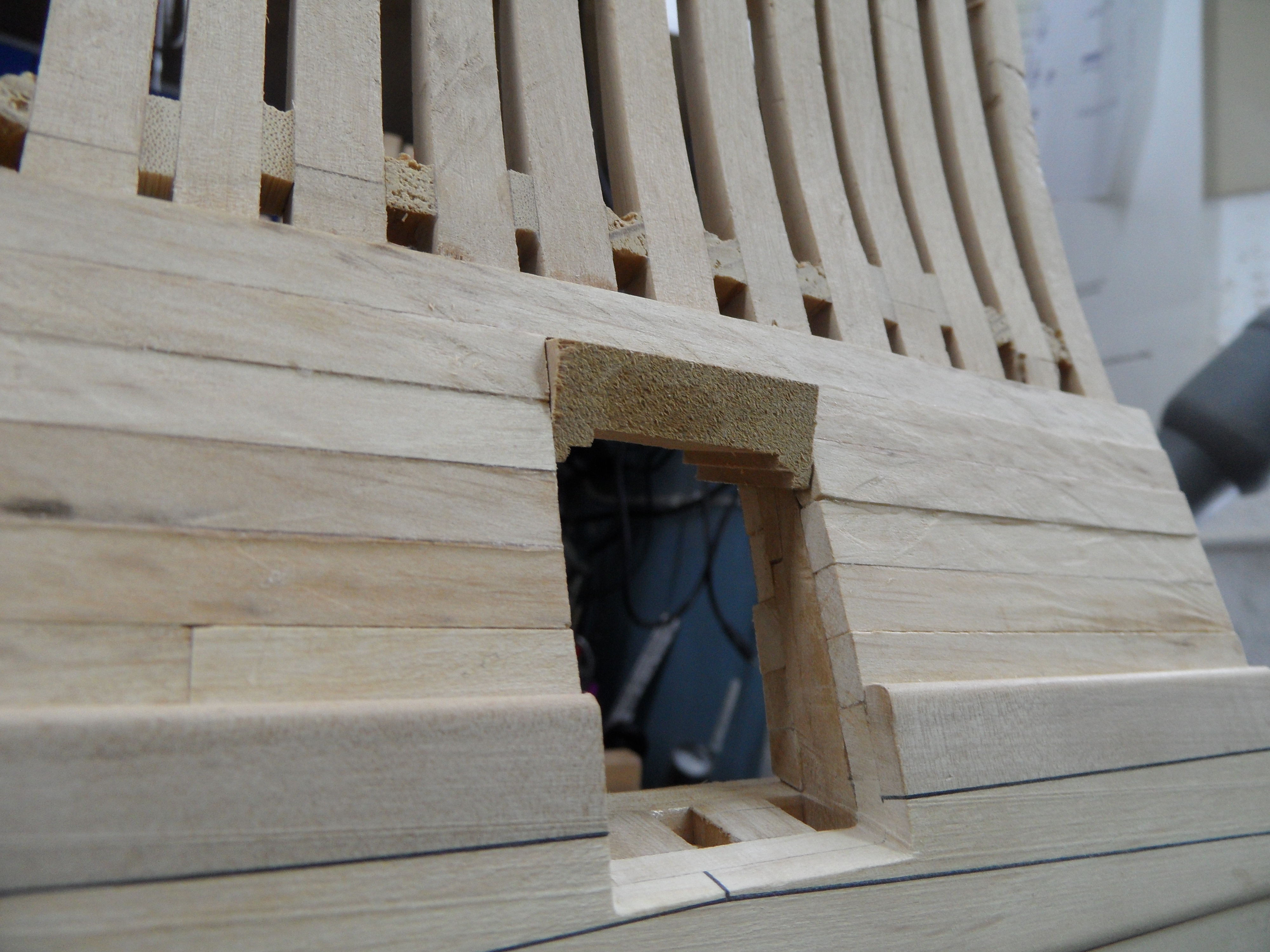 Planując kolejny postęp prac, postanowiłem położyć poszycie zewnętrzne w okolicy ambrazur by móc wykończyć otwory strzelnicze i nie wracać do tematu tych otworów gdy będzie zamontowana artyleria. Przyklejone listewki to poszycie, które zostanie pokryte odbojnicami (Lower wal).