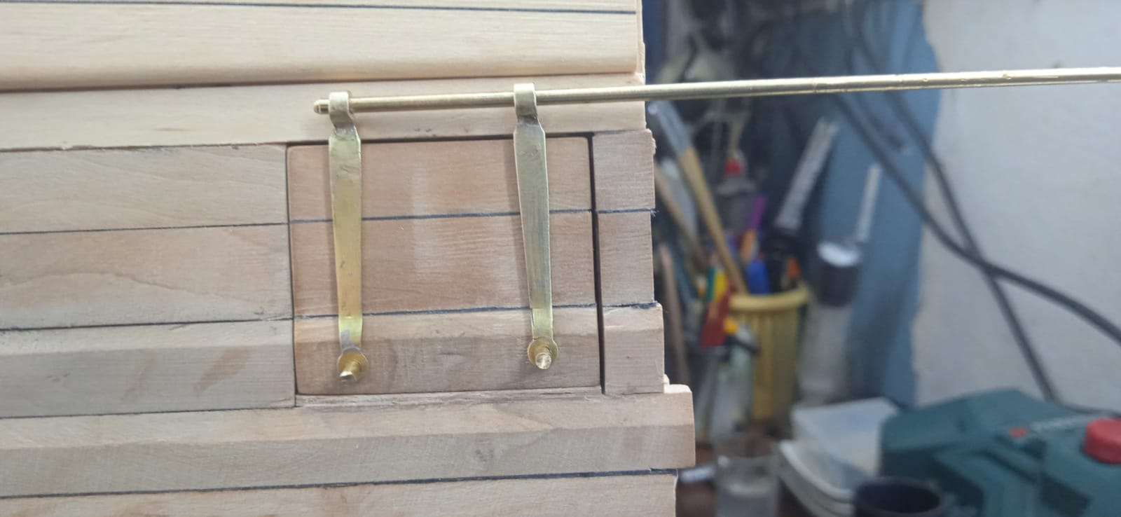 Sposób wykonania elementów odbojnic Elementy gotowe i wklejone w sekcję. Widoczne również klapy otworów strzelniczych. No i próba wykonania zawiasów do furt - blaszka1 mm, pręt fi 4 mm